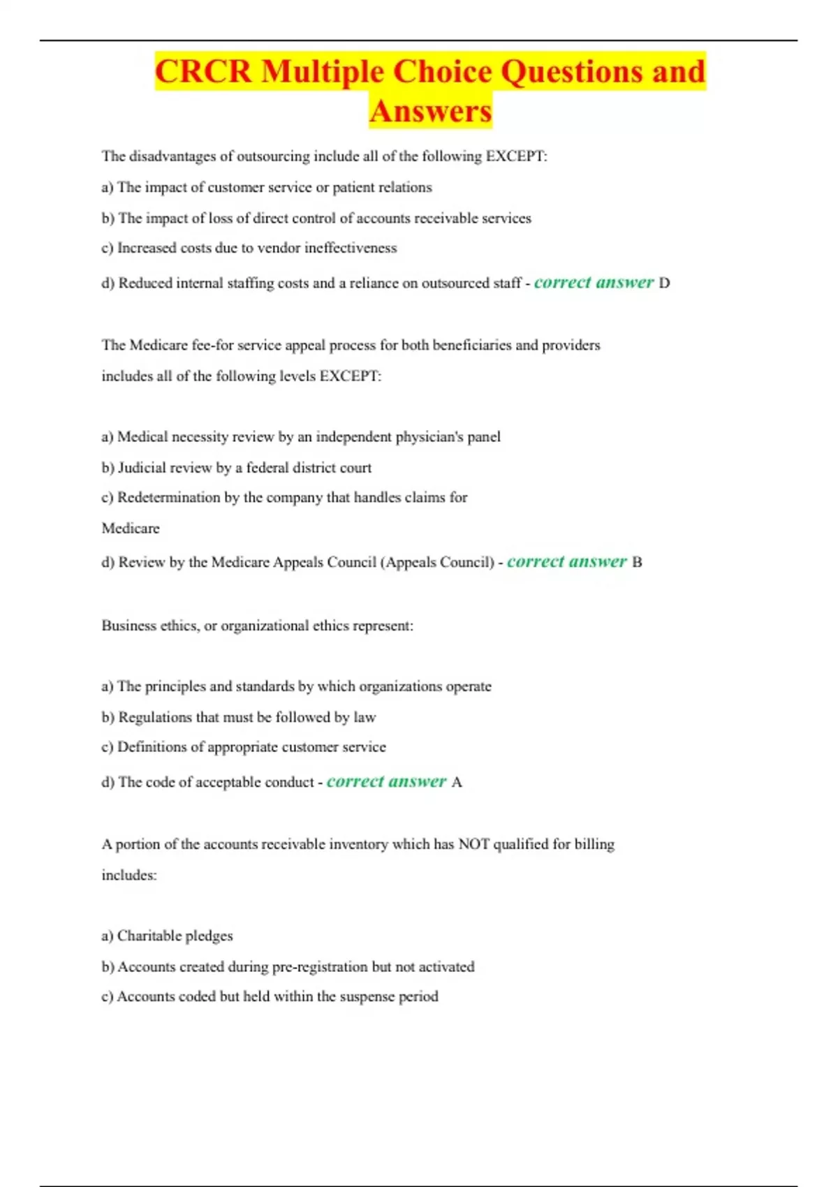 CRCR Multiple Choice Questions and Answers The disadvantages of outsourcing include all of the following EXCEPT: a) The impact of customer service or patient relations b) The impact of loss of direct control of accounts receivable services c) Increased costs due to vendor ineffectiveness d) Reduced internal staffing costs and a reliance on outsourced staff - correct answer D