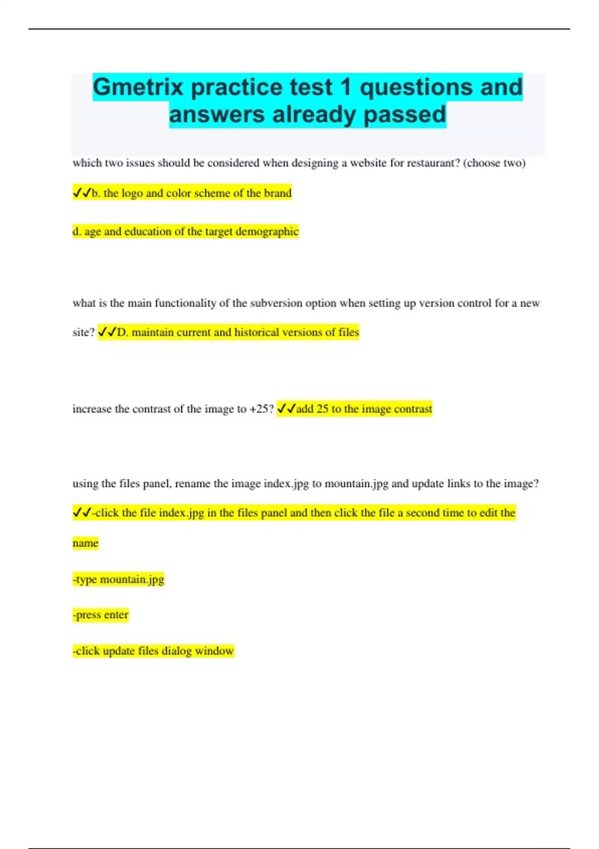 Gmetrix practice test 1 questions and answers already passed which two issues should be considered when designing a website for restaurant? (choose two) b. the logo and color scheme of the brand d. age and education of the target demographic what is the main functionality of the subversion option when setting up version control for a new site? D. maintain current and historical versions of files increase the contrast of the image to +25? add 25 to the image contrast using the files panel, rename the image to and update links to the image? -click the file in the files panel and then click the file a second time to edit the name -type -press enter -click update files dialog window which statement is true about using the material from the site such as wikipedia when using a creative commons license? de a full citation using standard style guides 1)where pages are saved on the computer______? 2) where the contents of the site are uploaded_____? 3) the folder where the contents of the site uploaded______? 4) contains the web page files for the site as well as all assets_______? 1)root folder 2)web server 3)remote folder 4)local site insert text that retains structure, but not basic formatting____? inserts both structured and simple HTML- formatted text___? inserts text that retains all structure , HTML formatting, and CSS styles___? inserts unformatted text___? 1) text with structure plus full formatting 2)text with structure 3)text with structure plus basic formatting 4)text only which browser is not a preview option in browserlab? a) opera which three are examples of design principles? (choose three ) c) balance d) symmetry e) repetition what are three advantages of using adobe browser lab for previewing and testing web pages? (choose three) c. ability to preview web pages in the multiple browsers on multiple operating systems d. ability to save testing money by reducing the need for dedicated testing money by reducing the need for dedicated testing hardware and software ty to preview web pages directly from dreamweaver without installing multiple browsers or publishing to an external server what allows the preview of the SWF or FLV files directly in a dreamweaver document? a) live view what are two ways to place fireworks objects into a dreamweaver document? (Choose two) b. insert> image objects> fireworks HTML e. in fireworks, select edit> copy HTML code. in dreamweaver, select edit> paste fireworks HTML which two steps are effective when creating an image map for an irregularly shaped portion of an image? (choose two.) c. use the polygon hotspot tool to create a hotspot d. draw the hot spot slightly larger than the