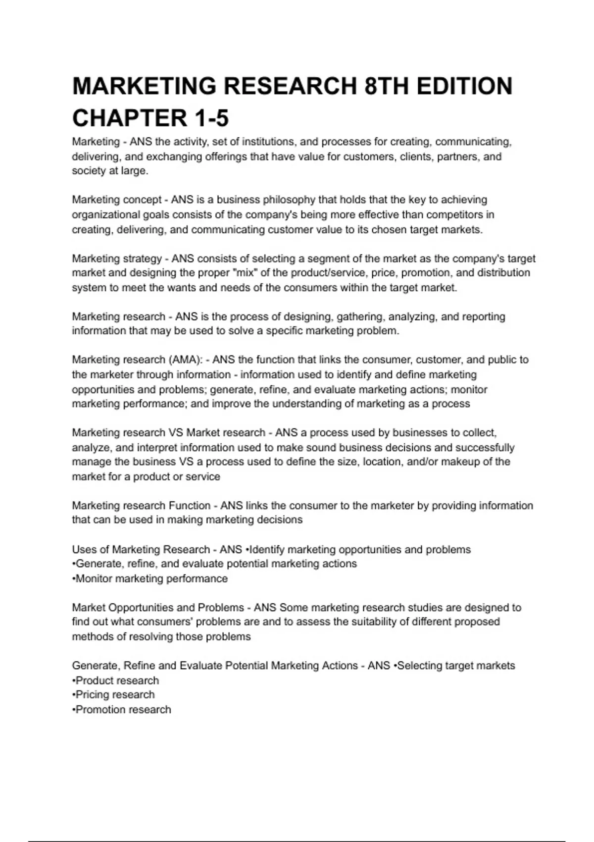 MARKETING RESEARCH 8TH EDITION CHAPTER 1-5 Marketing - ANS the activity, set of institutions, and processes for creating, communicating, delivering, and exchanging offerings that have value for customers, clients, partners, and society at large. Marketing concept - ANS is a business philosophy that holds that the key to achieving organizational goals consists of the company's being more effective than competitors in creating, delivering, and communicating customer value to its chosen target markets. Marketing strategy - ANS consists of selecting a segment of the market as the company's target market and designing the proper "mix" of the product/service, price, promotion, and distribution system to meet the wants and needs of the consumers within the target market. Marketing research - ANS is the process of designing, gathering, analyzing, and reporting information that may be used to solve a specific marketing problem. Marketing research (AMA): - ANS the function that links the consumer, customer, and public to the marketer through information - information used to identify and define marketing opportunities and problems; generate, refine, and evaluate marketing actions; monitor marketing performance; and improve the understanding of marketing as a process Marketing research VS Market research - ANS a process used by businesses to collect, analyze, and interpret information used to make sound business decisions and successfully manage the business VS a process used to define the size, location, and/or makeup of the market for a product or service Marketing research Function - ANS links the consumer to the marketer by providing information that can be used in making marketing decisions Uses of Marketing Research - ANS •Identify marketing opportunities and problems •Generate, refine, and evaluate potential marketing actions •Monitor marketing performance Market Opportunities and Problems - ANS Some marketing research studies are designed to find out what consumers' problems are and to assess the suitability of different proposed methods of resolving those problems
