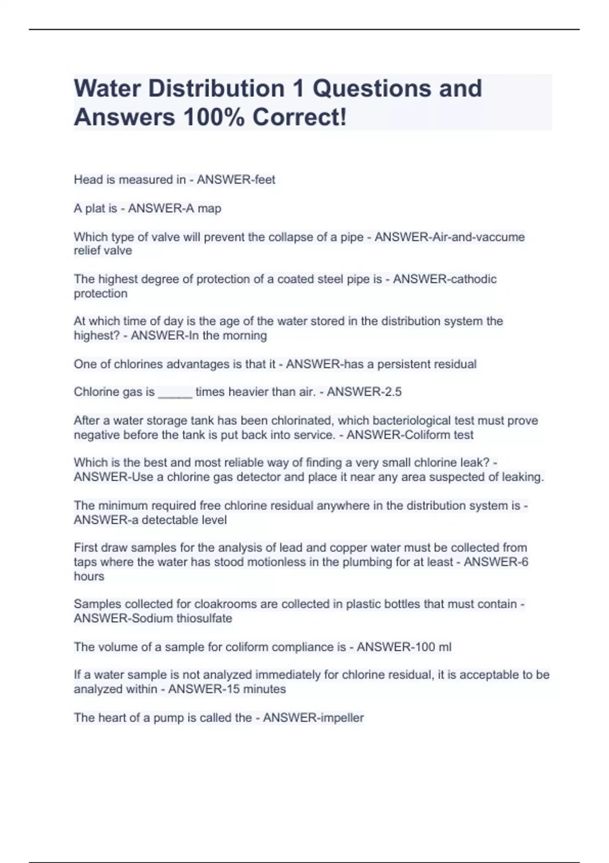 Head is measured in - ANSWER-feet A plat is - ANSWER-A map Which type of valve will prevent the collapse of a pipe - ANSWER-Air-and-vaccume relief valve The highest degree of protection of a coated steel pipe is - ANSWER-cathodic protection At which time of day is the age of the water stored in the distribution system the highest? - ANSWER-In the morning One of chlorines advantages is that it - ANSWER-has a persistent residual Chlorine gas is _____ times heavier than air. - ANSWER-2.5 After a water storage tank has been chlorinated, which bacteriological test must prove negative before the tank is put back into service. - ANSWER-Coliform test Which is the best and most reliable way of finding a very small chlorine leak? - ANSWER-Use a chlorine gas detector and place it near any area suspected of leaking. The minimum required free chlorine residual anywhere in the distribution system is - ANSWER-a detectable level First draw samples for the analysis of lead and copper water must be collected from taps where the water has stood motionless in the plumbing for at least - ANSWER-6 hours Samples collected for cloakrooms are collected in plastic bottles that must contain - ANSWER-Sodium thiosulfate The volume of a sample for coliform compliance is - ANSWER-100 ml If a water sample is not analyzed immediately for chlorine residual, it is acceptable to be analyzed within - ANSWER-15 minutes The heart of a pump is called the - ANSWER-impeller Which device serves the same function as the packing - ANSWER-Mechanical seal Which is used to stop air leakage into the casing around the pump shaft - ANSWER-seals