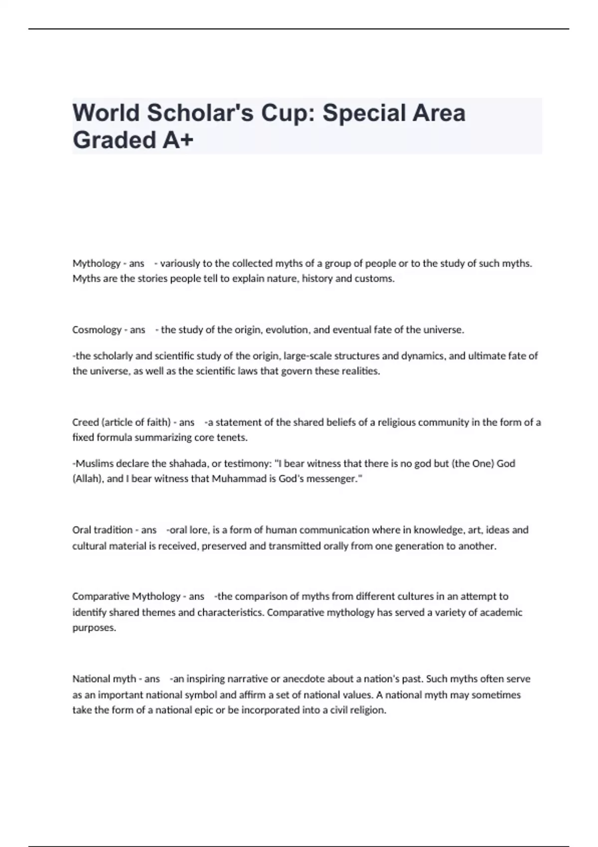 Mythology - ans - variously to the collected myths of a group of people or to the study of such myths. Myths are the stories people tell to explain nature, history and customs. Cosmology - ans - the study of the origin, evolution, and eventual fate of the universe. -the scholarly and scientific study of the origin, large-scale structures and dynamics, and ultimate fate of the universe, as well as the scientific laws that govern these realities. Creed (article of faith) - ans -a statement of the shared beliefs of a religious community in the form of a fixed formula summarizing core tenets. -Muslims declare the shahada, or testimony: "I bear witness that there is no god but (the One) God (Allah), and I bear witness that Muhammad is God's messenger." Oral tradition - ans -oral lore, is a form of human communication where in knowledge, art, ideas and cultural material is received, preserved and transmitted orally from one generation to another. Comparative Mythology - ans -the comparison of myths from different cultures in an attempt to identify shared themes and characteristics. Comparative mythology has served a variety of academic purposes. National myth - ans -an inspiring narrative or anecdote about a nation's past. Such myths often serve as an important national symbol and affirm a set of national values. A national myth may sometimes take the form of a national epic or be incorporated into a civil religion