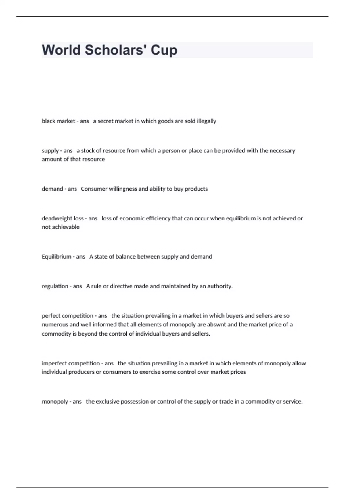 black market - ans a secret market in which goods are sold illegally supply - ans a stock of resource from which a person or place can be provided with the necessary amount of that resource demand - ans Consumer willingness and ability to buy products deadweight loss - ans loss of economic efficiency that can occur when equilibrium is not achieved or not achievable Equilibrium - ans A state of balance between supply and demand regulation - ans A rule or directive made and maintained by an authority. perfect competition - ans the situation prevailing in a market in which buyers and sellers are so numerous and well informed that all elements of monopoly are abswnt and the market price of a commodity is beyond the control of individual buyers and sellers. imperfect competition - ans the situation prevailing in a market in which elements of monopoly allow individual producers or consumers to exercise some control over market prices monopoly - ans the exclusive possession or control of the supply or trade in a commodity or service.