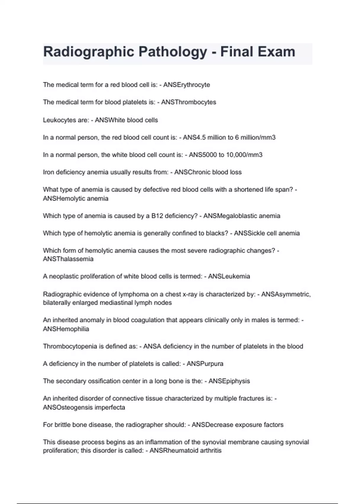 Radiographic Pathology - Final Exam 2024/2025 graded A+