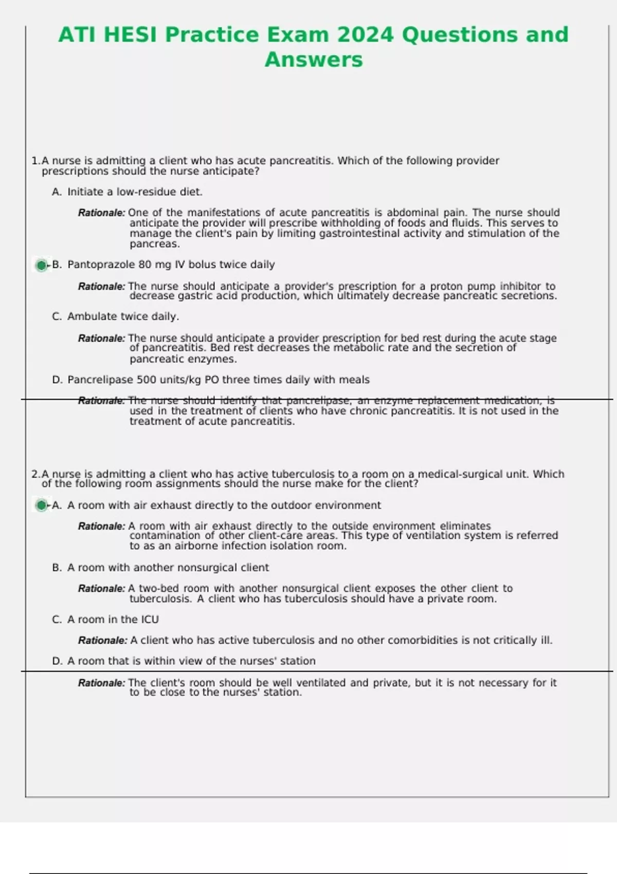 ATI HESI Practice Exam 2024 Questions and Answers 1. A nurse is admitting a client who has acute pancreatitis. Which of the following provider prescriptions should the nurse anticipate? A. Initiate a low-residue diet. Rationale: One of the manifestations of acute pancreatitis is abdominal pain. The nurse should anticipate the provider will prescribe withholding of foods and fluids. This serves to manage the client's pain by limiting gastrointestinal activity and stimulation of the pancreas. B. Pantoprazole 80 mg IV bolus twice daily Rationale: The nurse should anticipate a provider's prescription for a proton pump inhibitor to decrease gastric acid production, which ultimately decrease pancreatic secretions. C. Ambulate twice daily. Rationale: The nurse should anticipate a provider prescription for bed rest during the acute stage of pancreatitis. Bed rest decreases the metabolic rate and the secretion of pancreatic enzymes. D. Pancrelipase 500 units/kg PO three times daily with meals