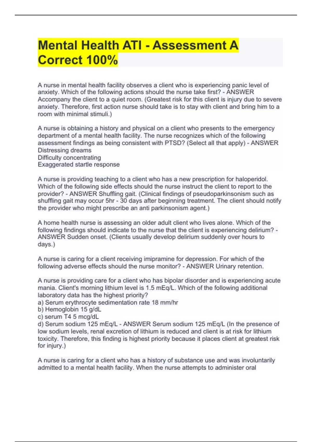 A nurse in mental health facility observes a client who is experiencing panic level of anxiety. Which of the following actions should the nurse take first? - ANSWER Accompany the client to a quiet room. (Greatest risk for this client is injury due to severe anxiety. Therefore, first action nurse should take is to stay with client and bring him to a room with minimal stimuli.) A nurse is obtaining a history and physical on a client who presents to the emergency department of a mental health facility. The nurse recognizes which of the following assessment findings as being consistent with PTSD? (Select all that apply) - ANSWER Distressing dreams Difficulty concentrating Exaggerated startle response A nurse is providing teaching to a client who has a new prescription for haloperidol. Which of the following side effects should the nurse instruct the client to report to the provider? - ANSWER Shuffling gait. (Clinical findings of pseudoparkinsonism such as shuffling gait may occur 5hr - 30 days after beginning treatment. The client should notify the provider who might prescribe an anti parkinsonism agent.) A home health nurse is assessing an older adult client who lives alone. Which of the following findings should indicate to the nurse that the client is experiencing delirium? - ANSWER Sudden onset. (Clients usually develop delirium suddenly over hours to days.) A nurse is caring for a client receiving imipramine for depression. For which of the following adverse effects should the nurse monitor? - ANSWER Urinary retention. A nurse is providing care for a client who has bipolar disorder and is experiencing acute mania. Client's morning lithium level is 1.5 mEq/L. Which of the following additional laboratory data has the highest priority? a) Serum erythrocyte sedimentation rate 18 mm/hr b) Hemoglobin 15 g/dL c) serum T4 5 mcg/dL d) Serum sodium 125 mEq/L - ANSWER Serum sodium 125 mEq/L (In the presence of low sodium levels, renal excretion of lithium is reduced and client is at risk for lithium toxicity. Therefore, this finding is highest priority because it places client at greatest risk for injury.) A nurse is caring for a client who has a history of substance use and was involuntarily admitted to a mental health facility. When the nurse attempts to administer oral lorazepam, the client refuses to take