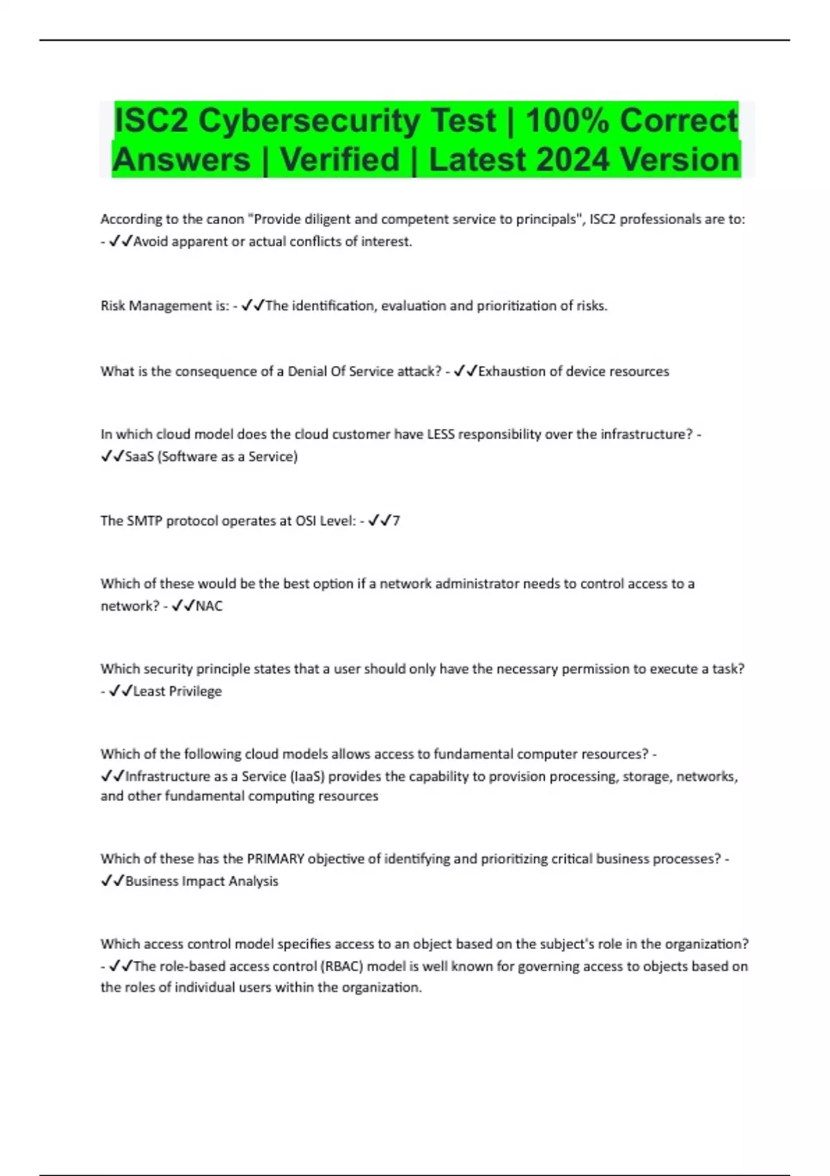 According to the canon "Provide diligent and competent service to principals", ISC2 professionals are to: - Avoid apparent or actual conflicts of interest. Risk Management is: - The identification, evaluation and prioritization of risks. What is the consequence of a Denial Of Service attack? - Exhaustion of device resources In which cloud model does the cloud customer have LESS responsibility over the infrastructure? - SaaS (Software as a Service) The SMTP protocol operates at OSI Level: - 7 Which of these would be the best option if a network administrator needs to control access to a network? - NAC Which security principle states that a user should only have the necessary permission to execute a task? - Least Privilege Which of the following cloud models allows access to fundamental computer resources? - Infrastructure as a Service (IaaS) provides the capability to provision processing, storage, networks, and other fundamental computing resources Which of these has the PRIMARY objective of identifying and prioritizing critical business processes? - Business Impact Analysis