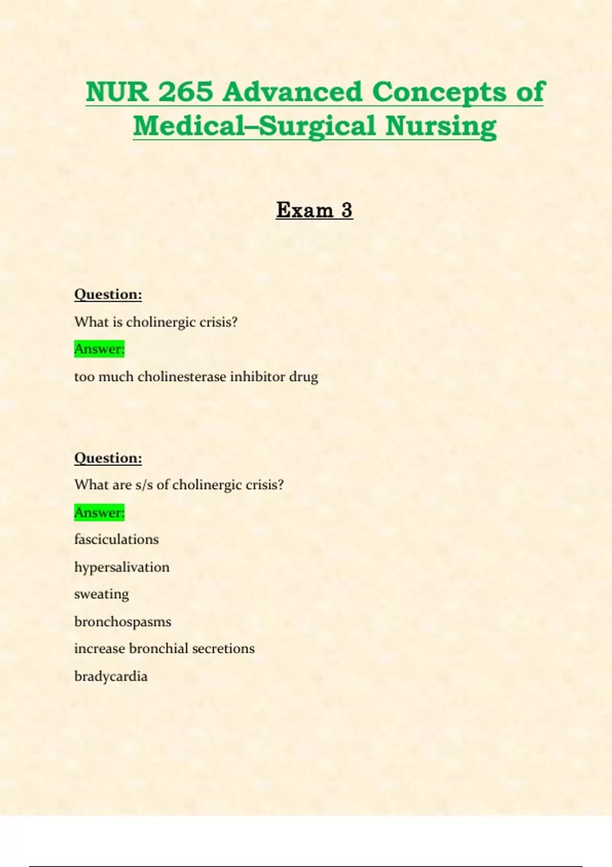 Exam 3: NUR265 / NUR 265 (Latest 2024 / 2025 Update) Advanced Concepts of Medical–Surgical Nursing Exam Review | Complete Guide with Questions and Verified Answers | 100% Correct - Galen Q: What is cholinergic crisis? Answer: too much cholinesterase inhibitor drug Q: What are s/s of cholinergic crisis? Answer: fasciculations hypersalivation sweating bronchospasms increase bronchial secretions bradycardia Q: What is tx for cholinergic crisis? Answer: atropine DO NOT GIVE ANTICHOLINESTERASE Q: What is myasthenic crisis? Answer: too little cholinesterase inhibitor drug Q: What is the priority with myasthenic crisis? Answer: resp function Q: What are s/s of myasthenic crisis? Answer: increase HR, RR, BP decrease u/o no cough or swallow reflex dry Q: What time should ChE inhibitor be given? Answer: 45-1hr before meals to avoid aspiration Q: What can tensilon test cause? Answer: cardiac dysrhythmias, have atropine on hand Q: What is nursing priority with myasthenic crisis? Answer: maintain airway, may require to intubate Q: What is Guillain-Barre? Answer: an uncommon acute inflammatory disorder that affects axons and/or myelin sheath (neurons can't impulse) Q: where does Guillain Barre Syndrome start Answer: -Starts in feet and hands (numbness, tingling) Q: What are causes of Guillain Barre? Answer: bacterial infection influenza epstein barr zika Q: What are s/s of guillain barre? Answer: loss of reflexes hypotension labile BP muscle weakness or paralysis (decreased DTR) numbness ataxia blurred or double vision palpitations pain tachycarida Q: What are complications from guillain barre? Answer: resp & cardiac problems decreased mobility, DVTs Q: What is tx for guillain barre? Answer: plasmapheresis asap IV immunoglobulin if can't do plasma right away Q: What do you NOT want to give w/ guillain barre? Answer: CORTICOSTERIODS Q: What are n/i with guillain barre? Answer: priority is airway monitor abgs monitor cardiac monitor for resp distress pt/ot for immobility mech vent if needed interdisciplinary tx Q: What is SCI?