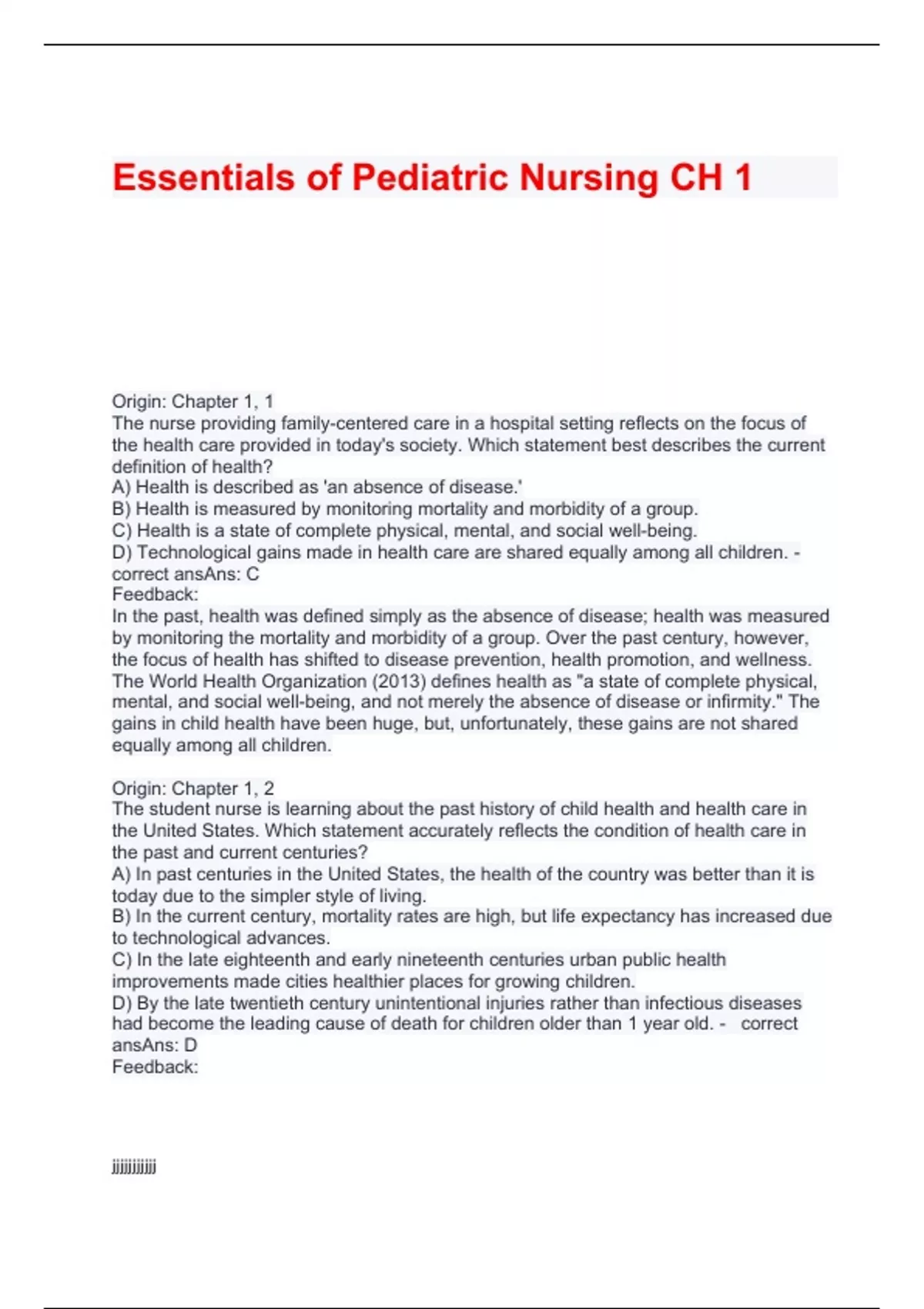 Essentials of Pediatric Nursing 4th EditionIn past centuries in the United States, the health of the country was poorer than it is today; mortality rates were high and life expectancy was short. Over the years the health of children received more and more attention, leading to a better understanding of sources of illness and improvements in sanitation, water, and nutrition. As a result, by the late twentieth century unintentional injuries rather than infectious diseases had become the leading cause of death for children older than 1 year old. Origin: Chapter 1, 3 The nurse is administering a number of therapeutic interventions for neonates, infants, and children on the pediatric unit. Which intervention contributes to an increase in chronic illness seen in early childhood? A) Administering antibiotics to prevent lethal infections B) Vaccinating children to prevent childhood diseases C) Using mechanical ventilation for premature infants D) Using corticosteroids as a treatment for asthma - correct ansAns: C Feedback: Using mechanical ventilation and medications to foster lung development in premature infants increases their survival rate. Yet the infants who survive are often faced with myriad chronic illnesses. Administering antibiotics to prevent lethal infections, vaccinating children to prevent childhood diseases, and using corticosteroids as a treatment for asthma may cause side effects, but do not contribute to chronic illness in children. Origin: Chapter 1, 4 The nurse is reviewing a copy of the U.S. Surgeon General's Report, Healthy People. Which nursing action best reflects the nurse fostering this health care agenda? A) The nurse signs up for classes to obtain an advanced degree in nursing B) The nurse volunteers at a local health care clinic providing free vaccinations for low-income populations C) The nurse performs an in-service on basic hospital equipment for student nurses