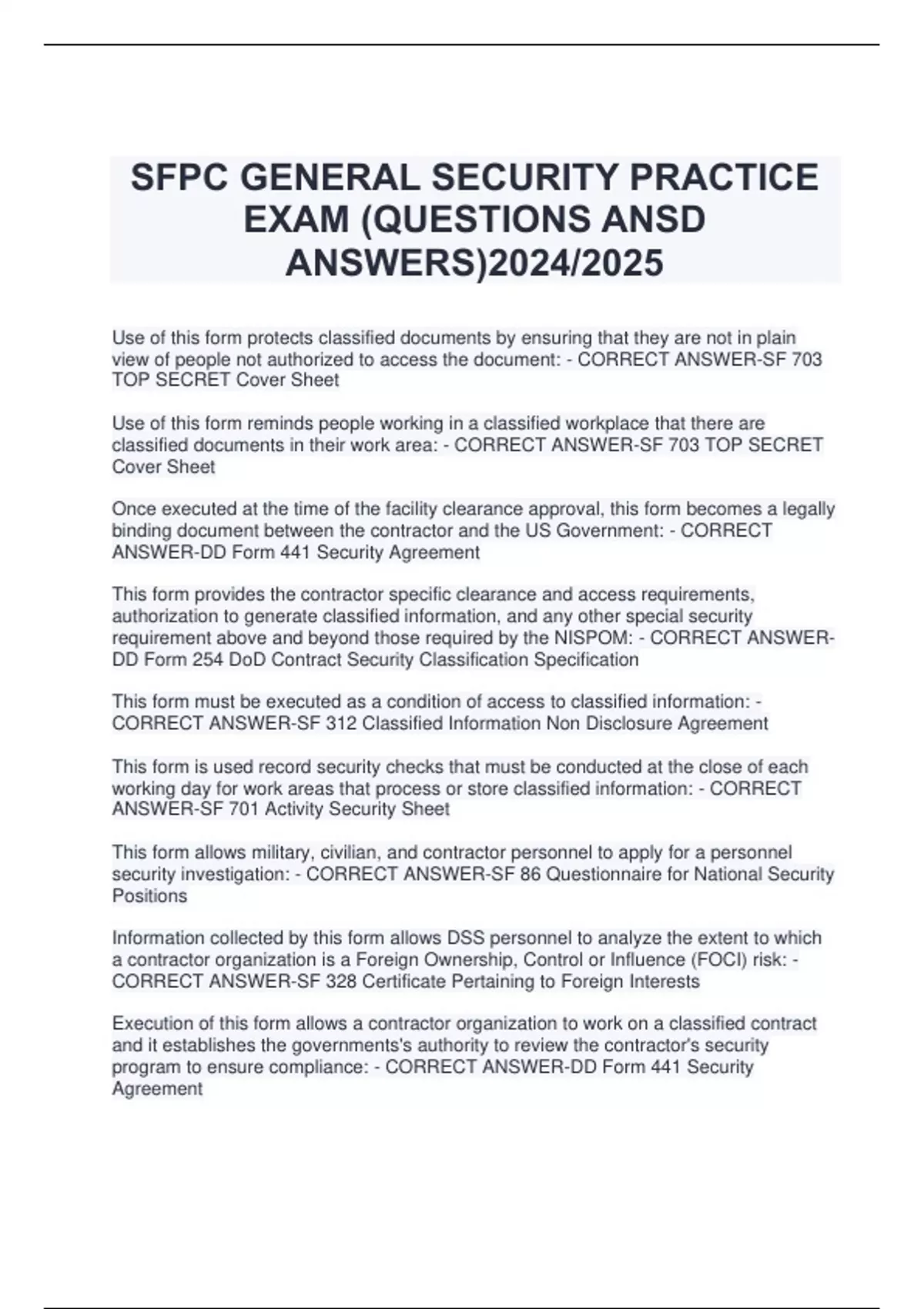 SFPC GENERAL SECURITY PRACTICE EXAM (QUESTIONS ANSD ANSWERS)2024/2025 Use of this form protects classified documents by ensuring that they are not in plain view of people not authorized to access the document: - CORRECT ANSWER-SF 703 TOP SECRET Cover Sheet Use of this form reminds people working in a classified workplace that there are classified documents in their work area: - CORRECT ANSWER-SF 703 TOP SECRET Cover Sheet Once executed at the time of the facility clearance approval, this form becomes a legally binding document between the contractor and the US Government: - CORRECT ANSWER-DD Form 441 Security Agreement This form provides the contractor specific clearance and access requirements, authorization to generate classified information, and any other special security requirement above and beyond those required by the NISPOM: - CORRECT ANSWERDD Form 254 DoD Contract Security Classification Specification This form must be executed as a condition of access to classified information: - CORRECT ANSWER-SF 312 Classified Information Non Disclosure Agreement This form is used record security checks that must be conducted at the close of each working day for work areas that process or store classified information: - CORRECT ANSWER-SF 701 Activity Security Sheet This form allows military, civilian, and contractor personnel to apply for a personnel security investigation: - CORRECT ANSWER-SF 86 Questionnaire for National Security Positions Information collected by this form allows DSS personnel to analyze the extent to which a contractor organization is a Foreign Ownership, Control or Influence (FOCI) risk: - CORRECT ANSWER-SF 328 Certificate Pertaining to Foreign Interests Execution of this form allows a contractor organization to work on a classified contract and it establishes the governments's authority to review the contractor's security program to ensure compliance: - CORRECT ANSWER-DD Form 441 Security Agreement This form authorizes th
