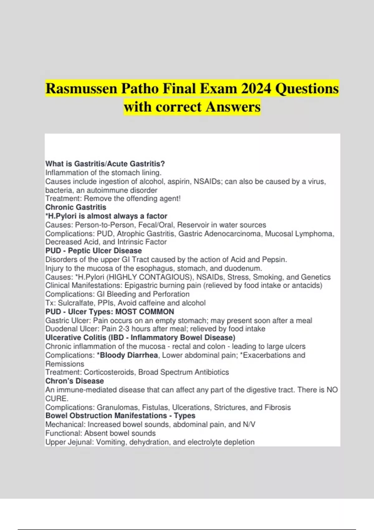 Rasmussen Patho Final Exam 2024 Questions with correct Answers What is Gastritis/Acute Gastritis? Inflammation of the stomach lining. Causes include ingestion of alcohol, aspirin, NSAIDs; can also be caused by a virus, bacteria, an autoimmune disorder Treatment: Remove the offending agent! Chronic Gastritis *H.Pylori is almost always a factor Causes: Person-to-Person, Fecal/Oral, Reservoir in water sources Complications: PUD, Atrophic Gastritis, Gastric Adenocarcinoma, Mucosal Lymphoma, Decreased Acid, and Intrinsic Factor PUD - Peptic Ulcer Disease Disorders of the upper GI Tract caused by the action of Acid and Pepsin. Injury to the mucosa of the esophagus, stomach, and duodenum. Causes: *H.Pylori (HIGHLY CONTAGIOUS), NSAIDs, Stress, Smoking, and Genetics Clinical Manifestations: Epigastric burning pain (relieved by food intake or antacids) Complications: GI Bleeding and Perforation Tx: Sulcralfate, PPIs, Avoid caffeine and alcohol PUD - Ulcer Types: MOST COMMON Gastric Ulcer: Pain occurs on an empty stomach; may present soon after a meal Duodenal Ulcer: Pain 2-3 hours after meal; relieved by food intake Ulcerative Colitis (IBD - Inflammatory Bowel Disease) Chronic inflammation of the mucosa - rectal and colon - leading to large ulcers Complications: *Bloody Diarrhea, Lower abdominal pain; *Exacerbations and Remissions Treatment: Corticosteroids, Broad Spectrum Antibiotics Chron's Disease An immune-mediated disease that can affect any part of the digestive tract. There is NO CURE. Complications: Granulomas, Fistulas, Ulcerations, Strictures, and Fibrosis Bowel Obstruction Manifestations - Types Mechanical: Increased bowel sounds, abdominal pain, and N/V Functional: Absent bowel sounds Upper Jejunal: Vomiting, dehydration, and electrolyte depletion Distal Small Bowel/Ilium: Constipation What percentage of the pancreas is Endocrine function? 5% - Pancreas secretes hormones into the blood *Exocrine function: Pancreas secretes digestive juice into the duodenum Pancreatic Cancer About 2% of all CA; Ranks 4th among malignant deaths. Risks: Smoking, Obesity Manifestations: Jaundice, Malabsorption, weight loss, abdominal pain, nausea Tx: Surgery, Chemo Gastroesophageal Varices Management Varicies are a result of Portal Hypertension d/t Cirrhosis of the liver; Alcoholism and Viral Hepatitis Dx: Endoscopy, Abdominal CT Scan, Upper GI Barrium Tx: Fluids (NaCl), Administer Blood Products, Vasopressin IV, H2 Blockers, PPIs; Surgical Banding and Balloon Therapy Diverticulosis Syndrome of "Outpouchings"/Herniations through the muscular layer of the colon. *HIGH FIBER DIET Diverticulitis Inflammation of the "Outpouchings" *LOW FIBER DIET Assessment of Kidney Disease Palpation of the CVA for pain/tenderness *CVA = Costalvertebral Angle Kidney Cancer S/S Is typically asymptomatic until advanced. Most common is CVA tenderness, hematuria, palpable abdominal mass, dyspnea, cough, bone pain secondary to metastasis Dialysis Benefits and Risks Used for pts with ATN/CKD in stage 5 in order to remove metabolic waste and correct fluid and electrolyte imbalances. Pts are at risk for Hypotension after treatment because they Hypertensive prior to treatment. TYPES of Acute Kidney Injury (AKI) PRERENAL: Conditions that diminish perfusion of the kidney - Hypovolemia, Hypotension, Heart Failure, Renal Artery Obstruction, Fever, Burns, Edema, Ascites, ACE Inhibitors, NSAIDs POSTRENAL: Obstruction of the normal outflow of urine from kidneys - Renal Pelvis, Ureters, Bladder Outlet, Urethra Causes: BPH, Kinked Catheter, Intra-abdominal Tumors, Strictures, Calculi INTRINSIC/INTRARENAL: Primary dysfunction of the nephrons and the kidney itself! The most common problem within the renal tubules results in *ATN(Acute Tubular Necrosis). Causes of ATN: Nephrotoxic insults: Contrast Media, Sepsis, Vancomycin, Chemo; Lack of O2, Alcohol, Drugs PHASES of Acute Kidney Injury (AKI) PRODROMAL: *Insult to the kidney has already occurred. Serum BUN and Creatinine is ELEVATED. OLIGURIC: Normal urine output of 50-400mL daily. Oliguria, Uremia, decreased GFR, Hypervolemia. S/S: Fluid excess, Hyperkalemia, Uremic Syndrome, Metabolic Acidosis POSTOLIGURIC: Termination of the Oliguric phase represents recovery. Urine volume increases, tubular function improves fluid volume deficit until kidneys recover. Cystitis Acute onset of frequency, Urgency and Dysuria, Suprapubic Pain, Hematuria, Cloudy Urine. LOC in elderly could present as Dementia, as well as new-onset incontinence. Toxic Causes of Intrarenal