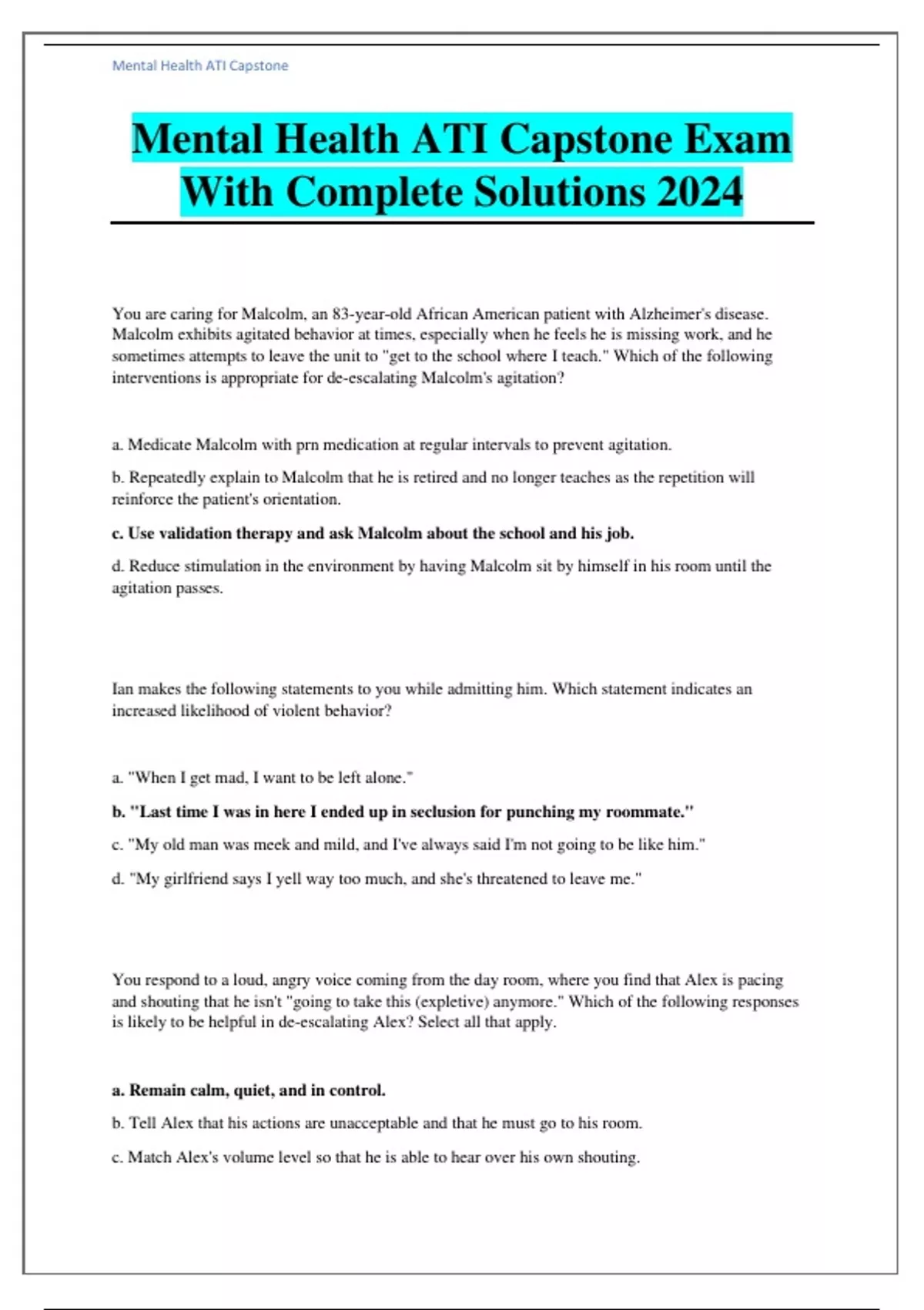 Mental Health ATI Capstone Exam With Complete Solutions 2024 You are caring for Malcolm, an 83-year-old African American patient with Alzheimer's disease. Malcolm exhibits agitated behavior at times, especially when he feels he is missing work, and he sometimes attempts to leave the unit to "get to the school where I teach." Which of the following interventions is appropriate for de-escalating Malcolm's agitation? a. Medicate Malcolm with prn medication at regular intervals to prevent agitation. b. Repeatedly explain to Malcolm that he is retired and no longer teaches as the repetition will reinforce the patient's orientation. c. Use validation therapy and ask Malcolm about the school and his job. d. Reduce stimulation in the environment by having Malcolm sit by himself in his room until the agitation passes. Ian makes the following statements to you while admitting him. Which statement indicates an increased likelihood of violent behavior? a. "When I get mad, I want to be left alone." b. "Last time I was in here I ended up in seclusion for punching my roommate." c. "My old man was meek and mild, and I've always said I'm not going to be like him." d. "My girlfriend says I yell way too much, and she's threatened to leave me." You respond to a loud, angry voice coming from the day room, where you find that Alex is pacing and shouting that he isn't "going to take this (expletive) anymore." Which of the following responses is likely to be helpful in de-escalating Alex? Select all that apply. a. Remain calm, quiet, and in control. b. Tell Alex that his actions are unacceptable and that he must go to his room. c. Match Alex's volume level so that he is able to hear over his own shouting. d. Ask Alex if he can tell you what is upsetting him so you may be able to help. e. Stand close to Alex so you can intervene physically if needed to protect others. f. Tell Alex that he could be placed in seclusion if he cannot control himself so that the patient is aware of negative consequences. Andie is a patient anxiously waiting her turn to speak with you. As you are very busy, you ask Andie if she can wait a few minutes so that you can finish your task. Unfortunately the task takes longer than anticipated and you are delayed getting back to Andie. On seeing you approach her, Andie accuses you of lying and refuses to speak with you. Which response is most likely to be therapeutic at this time? a. "You are angry that I didn't speak with you when I promised I would." b. "I'm sorry for being late, but screaming at me is not the best way to handle it." c. "You are too angry to talk right now. I'll come back in 20 minutes, and we can try again." d. "Why are you angry? I told you that I was busy and would get to you as soon as I could."