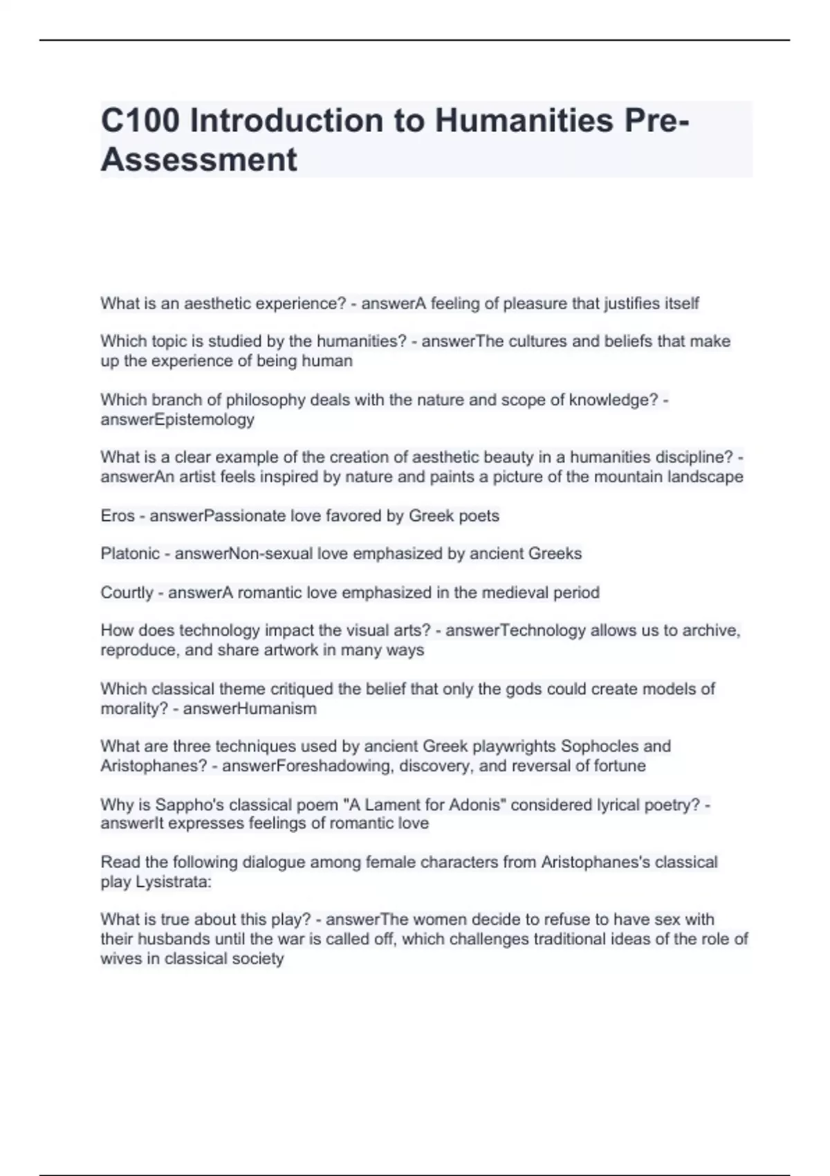 C100 Introduction to Humanities Pre-Assessment Questions and Answers fully solved