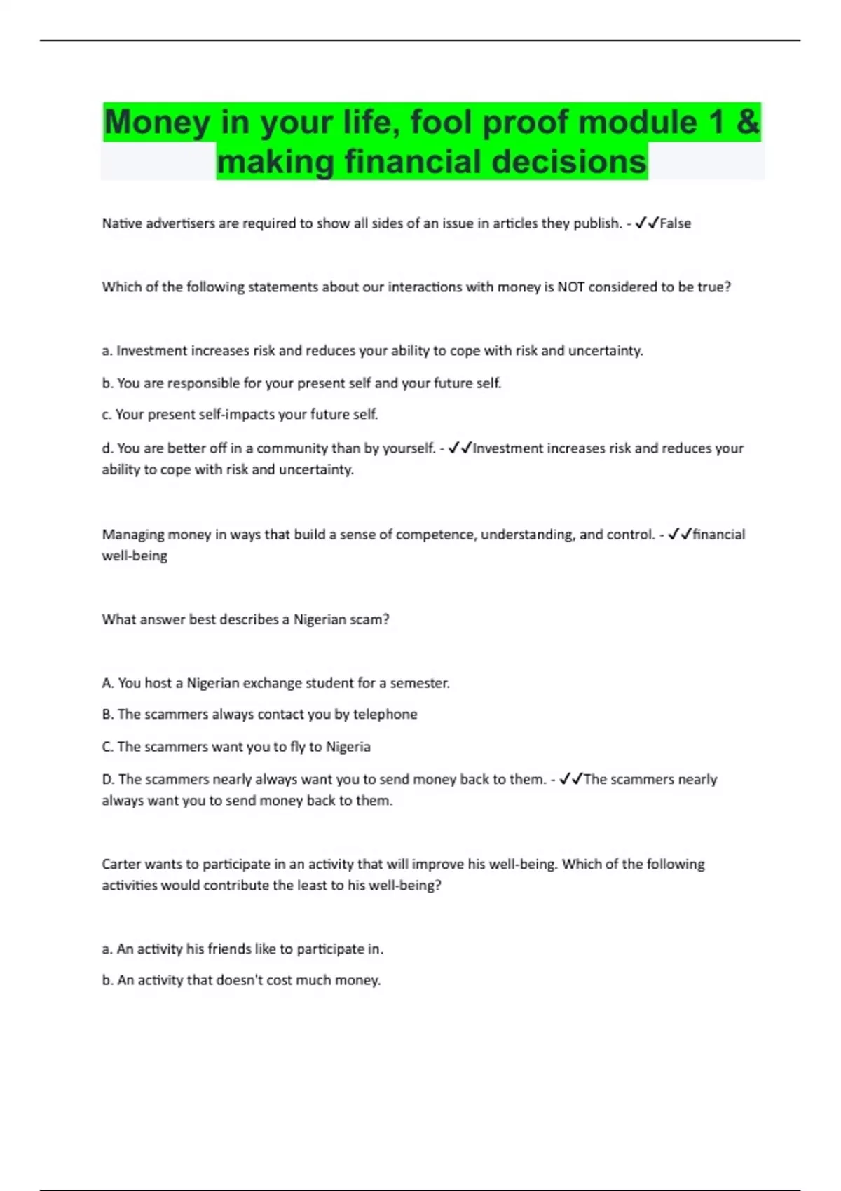 Native advertisers are required to show all sides of an issue in articles they publish. - False Which of the following statements about our interactions with money is NOT considered to be true? a. Investment increases risk and reduces your ability to cope with risk and uncertainty. b. You are responsible for your present self and your future self. c. Your present self-impacts your future self. d. You are better off in a community than by yourself. - Investment increases risk and reduces your ability to cope with risk and uncertainty. Managing money in ways that build a sense of competence, understanding, and control. - financial well-being What answer best describes a Nigerian scam? A. You host a Nigerian exchange student for a semester. B. The scammers always contact you by telephone C. The scammers want you to fly to Nigeria D. The scammers nearly always want you to send money back to them. - The scammers nearly always want you to send money back to them. Carter wants to participate in an activity that will improve his well-being. Which of the following activities would contribute the least to his well-being?