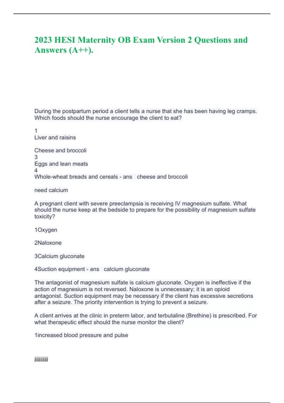 During the postpartum period a client tells a nurse that she has been having leg cramps. Which foods should the nurse encourage the client to eat? 1 Liver and raisins Cheese and broccoli 3 Eggs and lean meats 4 Whole-wheat breads and cereals - ans cheese and broccoli need calcium A pregnant client with severe preeclampsia is receiving IV magnesium sulfate. What should the nurse keep at the bedside to prepare for the possibility of magnesium sulfate toxicity? 1Oxygen 2Naloxone 3Calcium gluconate 4Suction equipment - ans calcium gluconate The antagonist of magnesium sulfate is calcium gluconate. Oxygen is ineffective if the action of magnesium is not reversed. Naloxone is unnecessary; it is an opioid antagonist. Suction equipment may be necessary if the client has excessive secretions after a seizure. The priority intervention is trying to prevent a seizure. A client arrives at the clinic in preterm labor, and terbutaline (Brethine) is prescribed. For what therapeutic effect should the nurse monitor the client? 1increased blood pressure and pulse