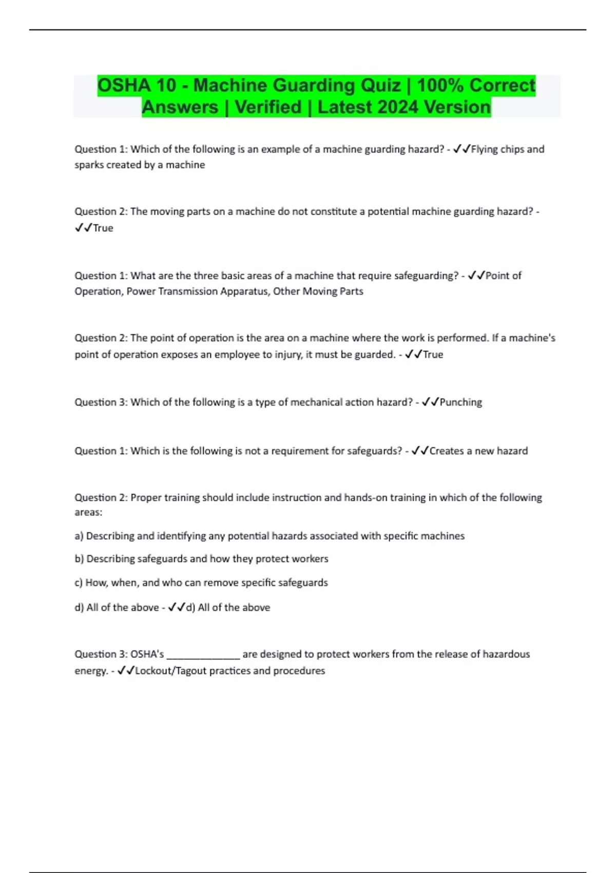 Question 1: Which of the following is an example of a machine guarding hazard? - Flying chips and sparks created by a machine Question 2: The moving parts on a machine do not constitute a potential machine guarding hazard? - True Question 1: What are the three basic areas of a machine that require safeguarding? - Point of Operation, Power Transmission Apparatus, Other Moving Parts Question 2: The point of operation is the area on a machine where the work is performed. If a machine's point of operation exposes an employee to injury, it must be guarded. - True Question 3: Which of the following is a type of mechanical action hazard? - Punching Question 1: Which is the following is not a requirement for safeguards? - Creates a new hazard Question 2: Proper training should include instruction and hands-on training in which of the following areas: a) Describing and identifying any potential hazards associated with specific machines