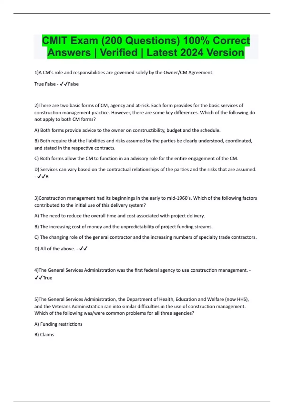 1)A CM's role and responsibilities are governed solely by the Owner/CM Agreement. True False - False 2)There are two basic forms of CM, agency and at-risk. Each form provides for the basic services of construction management practice. However, there are some key differences. Which of the following do not apply to both CM forms? A) Both forms provide advice to the owner on constructibility, budget and the schedule. B) Both require that the liabilities and risks assumed by the parties be clearly understood, coordinated, and stated in the respective contracts. C) Both forms allow the CM to function in an advisory role for the entire engagement of the CM. D) Services can vary based on the contractual relationships of the parties and the risks that are assumed. - B 3)Construction management had its beginnings in the early to mid-1960's. Which of the following factors contributed to the initial use of this delivery system? A) The need to reduce the overall time and cost associated with project delivery. B) The increasing cost of money and the unpredictability of project funding streams. C) The changing role of the general contractor and the increasing numbers of specialty trade contractors. D) All of the above. - 4)The General Services Administration was the first federal agency to use construction management. - True 5)The General Services Administration, the Department of Health, Education and Welfare (now HHS), and the Veterans Administration ran into similar difficulties in the use of construction management. Which of the following was/were common problems for all three agencies? A) Funding restrictions B) Claims