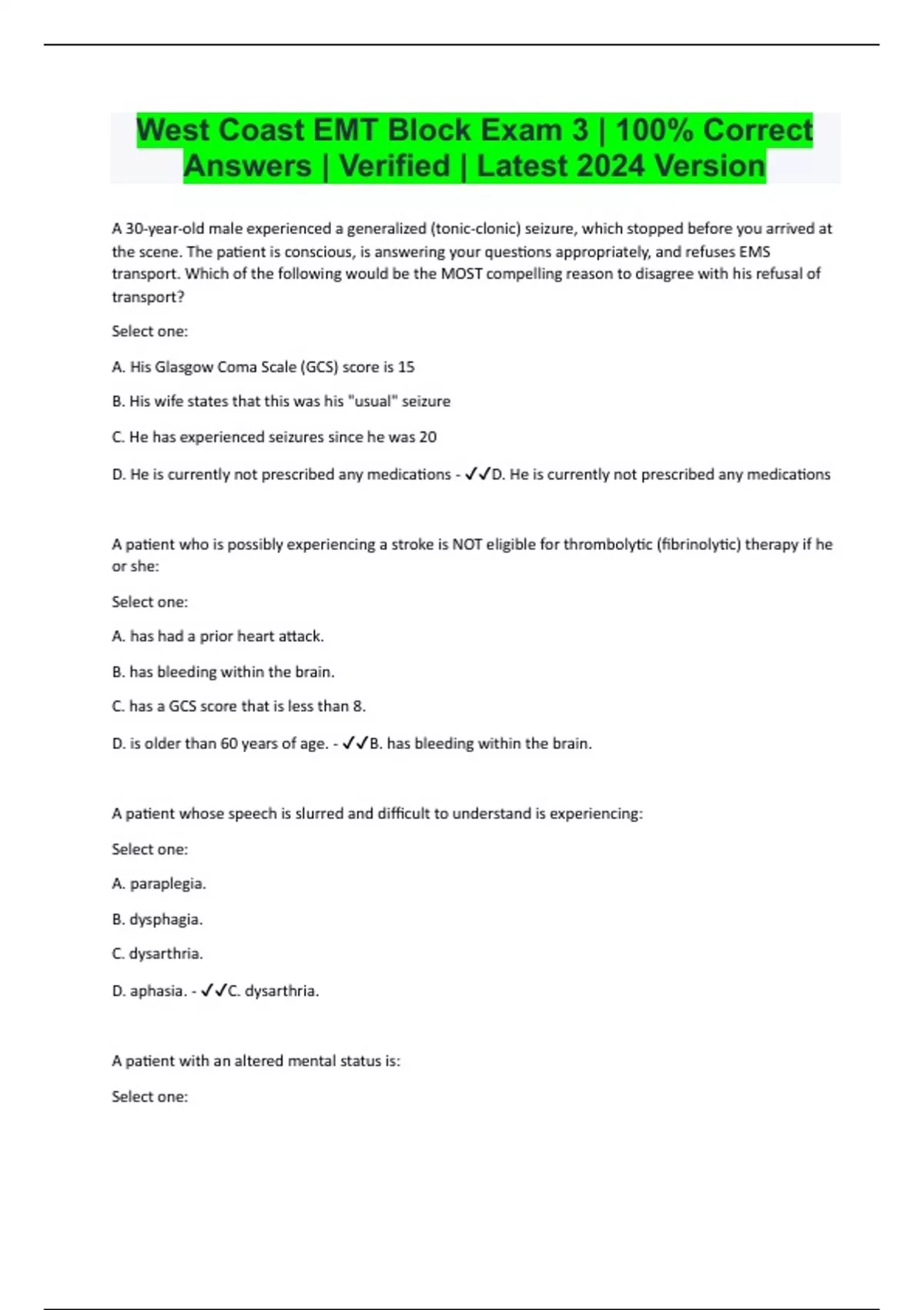 A 30-year-old male experienced a generalized (tonic-clonic) seizure, which stopped before you arrived at the scene. The patient is conscious, is answering your questions appropriately, and refuses EMS transport. Which of the following would be the MOST compelling reason to disagree with his refusal of transport? Select one: A. His Glasgow Coma Scale (GCS) score is 15 B. His wife states that this was his "usual" seizure C. He has experienced seizures since he was 20 D. He is currently not prescribed any medications - D. He is currently not prescribed any medications A patient who is possibly experiencing a stroke is NOT eligible for thrombolytic (fibrinolytic) therapy if he or she: Select one: A. has had a prior heart attack. B. has bleeding within the brain. C. has a GCS score that is less than 8. D. is older than 60 years of age. - B. has bleeding within the brain. A patient whose speech is slurred and difficult to understand is experiencing: Select one: A. paraplegia. B. dysphagia. C. dysarthria. D. aphasia. - C. dysarthria.
