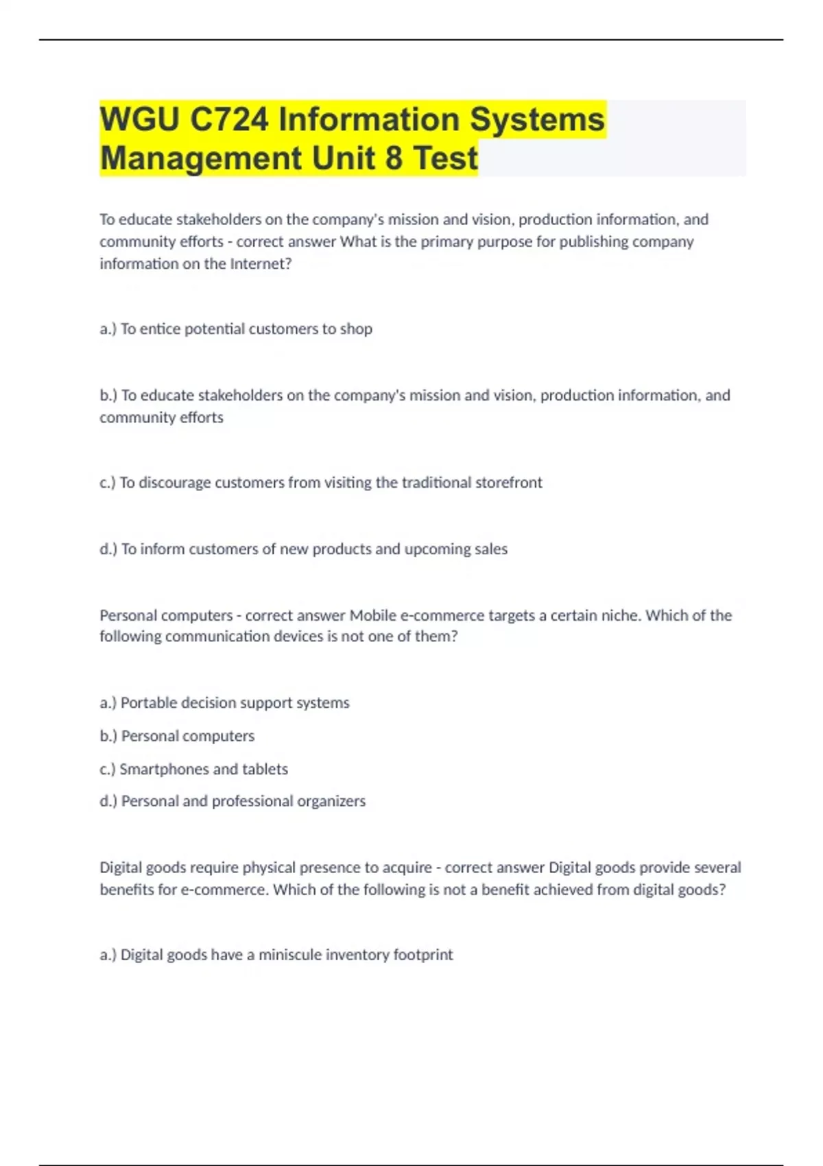 WGU C724 Information Systems Management Unit 8 Test To educate stakeholders on the company's mission and vision, production information, and community efforts - correct answer What is the primary purpose for publishing company information on the Internet? a.) To entice potential customers to shop b.) To educate stakeholders on the company's mission and vision, production information, and community efforts c.) To discourage customers from visiting the traditional storefront d.) To inform customers of new products and upcoming sales Personal computers - correct answer Mobile e-commerce targets a certain niche. Which of the following communication devices is not one of them?