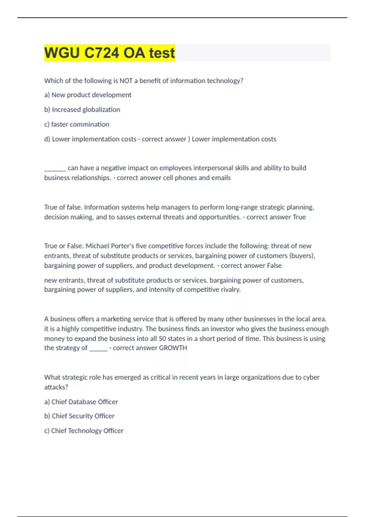 WGU BUIT 3000 C724 Information Systems Management OA Final study guide Which of the following is NOT a benefit of information technology? a) New product development b) Increased globalization c) faster commination d) Lower implementation costs - correct answer ) Lower implementation costs ______ can have a negative impact on employees interpersonal skills and ability to build business relationships. - correct answer cell phones and emails True of false. Information systems help managers to perform long-range strategic planning, decision making, and to sasses external threats and opportunities. - correct answer True
