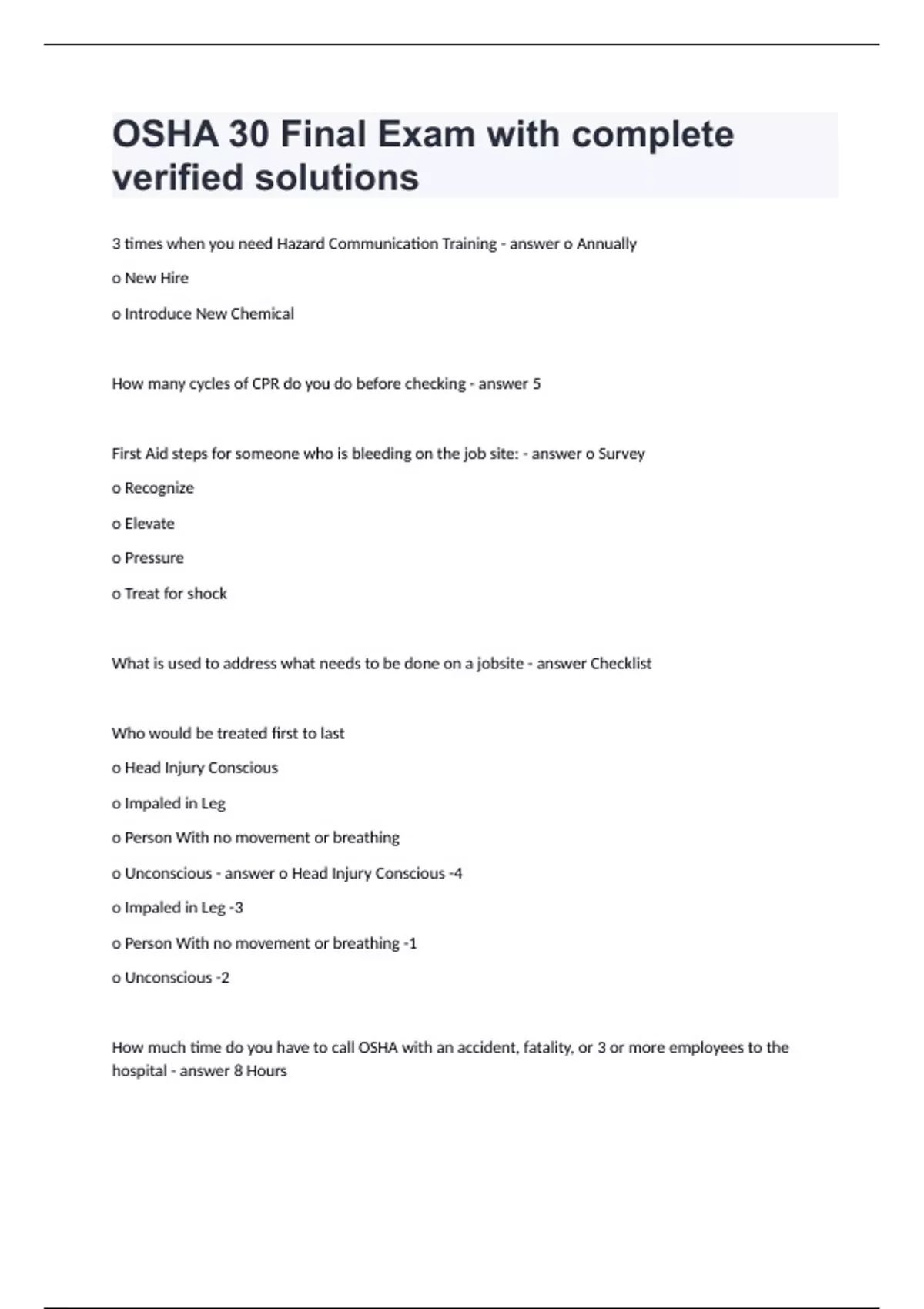 3 times when you need Hazard Communication Training o Annually o New Hire o Introduce New Chemical How many cycles of CPR do you do before checking 5 First Aid steps for someone who is bleeding on the job site: o Survey o Recognize o Elevate o Pressure o Treat for shock What is used to address what needs to be done on a jobsite Checklist Who would be treated first to last o Head Injury Conscious o Impaled in Leg o Person With no movement or breathing o Unconscious o Head Injury Conscious -4 o Impaled in Leg -3 o Person With no movement or breathing -1 o Unconscious -2 How much time do you have to call OSHA with an accident, fatality, or 3 or more employees to the hospital 8 Hours Name 2 potential exposure controls needed when respiratory infection and blood is present Gloves and Mask What type of program does management implement that gives all employees value Behavioral Based Program What is the minimum weight for a scaffold to support The scaffolds weight plus 4 times the maximum load What item is placed on a 300 Log, and through what dates must it be posted? o Recordable o Posted From Feb 1 to May 1 What height do you have to have railing on stairs 42 inches or 4th step What does the investigator need to find out The root cause What is an accident where no one is hurt Near Miss What is the number of fire extinguishers needed on a 5 story building with 1000 sq ft floors 5 Where does a company meet for accountability when exiting Accountability Space Acceptable 02 content of a confined space 19.5 - 22.5 What is the documents that defines the SOP EAP Shock symptoms o Face is red, raise the head o Face is pale, raise the tale (feet) o Difficulty breathing, use semi-sit up position Signs and Symptoms of Hypertension headache, high blood pressure, low blood sugar Fire Tetrahedron Oxygen, Fuel, Temperature, Chain Reaction Classifications of fires o A - trash, ash, paper, etc. o B - Boiling liquids o C - CO2 for Electrical currents o D - Copper based for metals o K - Kitchen Grease fires o Halen only used by Military because it stays in the Ozone SF needed for fire extinguishers 1 per 3000 SF per floor) SDS Section Numbers (Part 1) ID Identification SDS Section Numbers (Part 2) Hazard ID SDS Section Numbers (Part 4) First Aid SDS Section Numbers (Part 5) Fire fighting SDS Section Numbers (Part 7) Handling & Storage SDS Section Numbers (Part 8) PPE/Exposure Controls SDS Section Numbers (Part 16) Other / 704 Marker Ladder Ratio 4 to 1 ratio (4 feet up to 1 foot out) When must ladder be tied off to building 20 feet up and 5 feet out Can a crane lift a load at a 90 degree angle Nope When must you tie off in steel erection 30 ft When can you work under a suspended load in steel erection Must be certified and insured to work under a suspended load In Excavations, what must be done when you dig 20' or more down must have a structural engineer approve If a trench is 2 feet deep without any shoring, what can be done to bring it into compliance? Nothing, it is not out of compliance Must shield welder and any employees working within ____ feet of hot work with amber glasses/goggles 20 ft Must call OSHA if ... Fatality and 3 or more injured on same incident Keep training records for ... 5 years