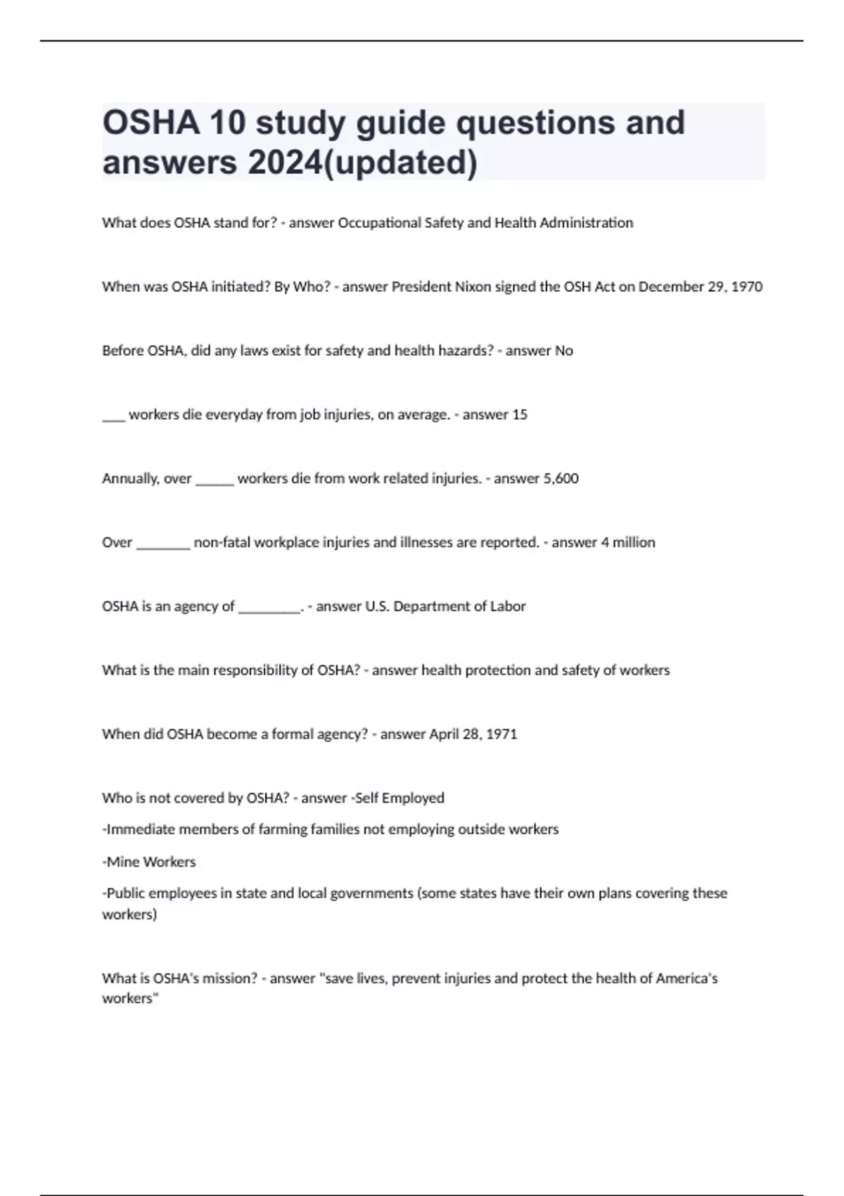 hat does OSHA stand for? Occupational Safety and Health Administration When was OSHA initiated? By Who? President Nixon signed the OSH Act on December 29, 1970 Before OSHA, did any laws exist for safety and health hazards? No ___ workers die everyday from job injuries, on average. 15 Annually, over _____ workers die from work related injuries. 5,600 Over _______ non-fatal workplace injuries and illnesses are reported. 4 million OSHA is an agency of ________. U.S. Department of Labor What is the main responsibility of OSHA? health protection and safety of workers When did OSHA become a formal agency? April 28, 1971 Who is not covered by OSHA? -Self Employed -Immediate members of farming families not employing outside workers -Mine Workers -Public employees in state and local governments (some states have their own plans covering these workers) What is OSHA's mission? "save lives, prevent injuries and protect the health of America's workers" How do they carry out this mission? -Develop job safety and health standards and enforce them through work site inspections -Maintain a reporting and record keeping system to keep track of job-related injuries and illnesses -Provide training programs to increase knowledge about occupational safety and health What rights do you have under OSHA? -a safe and healthful workplace -know about hazardous chemicals -information about injuries and illnesses in your workplace -complain or request hazard correction from employer -training -hazard exposure and medical records -file a complaint with OSHA -participate in OSHA inspection -be free from retaliation from exercising safety and health rights "Each employer shall furnish to each of his employees employment and a place of employment which are free from recognized hazards that are causing or are likely to cause death or serious physical harm to his employees." Which right is this an example of? The right to a safe and healthful workplace T/F: A written hazard communication program must be provided by every employer. true-- under the right to know about hazardous chemicals According the right to know about hazardous chemicals, a written hazard communication program MUST be provided and include: -labels on containers -MSDSs -Worker training- including effects of chemical hazards and protection OSHA record-keeping rule -most employers with more than 10 workers must keep a log of injuries and illnesses (OSHA 300) -workers can review the current log and the logs within the past 5 years -workers can review the annually posted summary of the injuries and illnesses Workers can review the current log and logs within the past __ years 5 Workers can express their concerns without fear of termination or discrimination, but ________. the complaint must be in good faith T/F: OSHA protects workers who complain to their employer about unsafe or unhealthy conditions in the workplace. true T/F: OSHA must provide training to employees on health and safety hazards. false: it is the employer's responsibility. Employers must provide training on health and safety hazards What are examples of some health and safety hazards that employers must provide employee training for? -bloodborne pathogens -noise -fall hazards -PPE