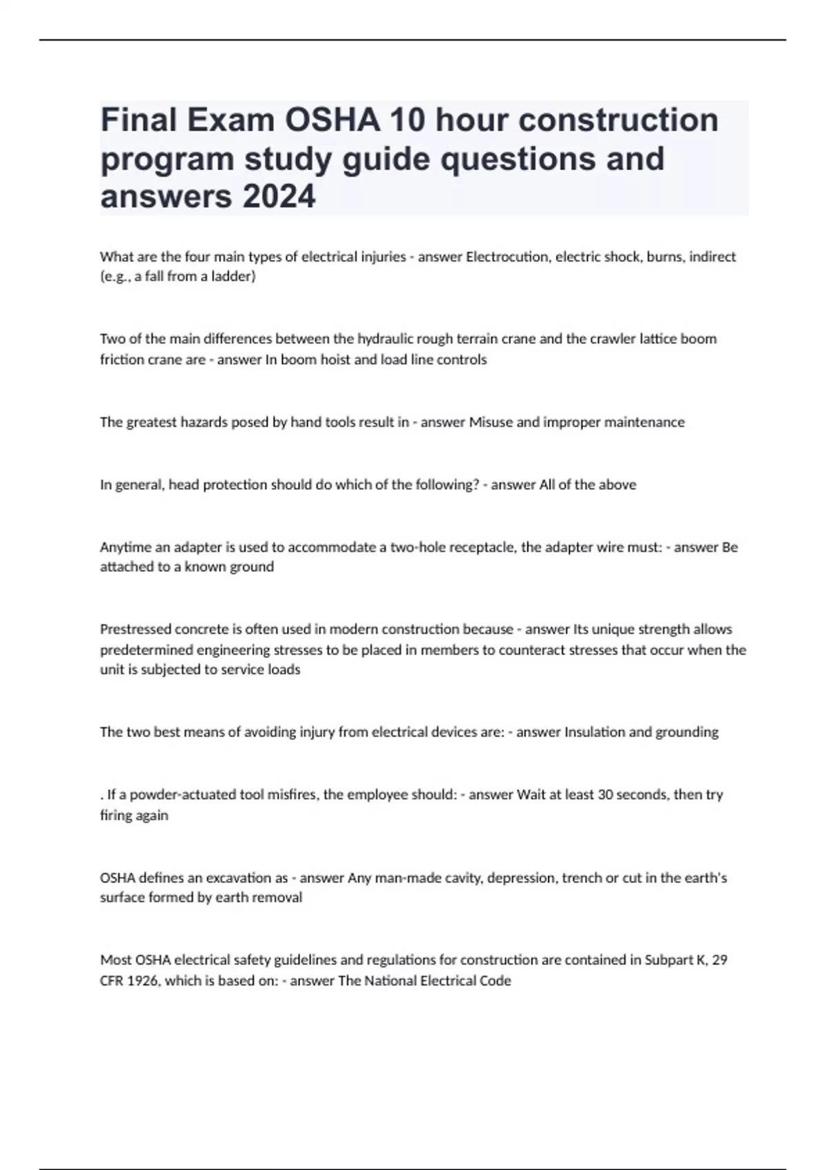 Final Exam OSHA 10 hour construction program study guide questions and answers 2024