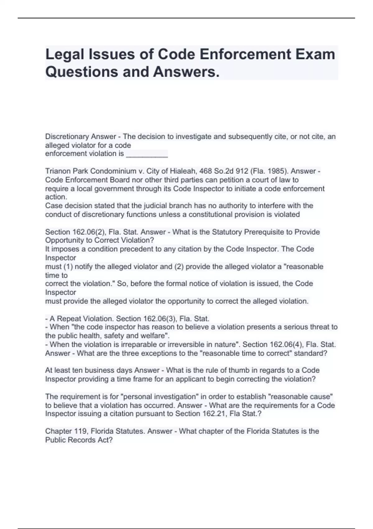Legal Issues of Code Enforcement Exam Questions and Answers