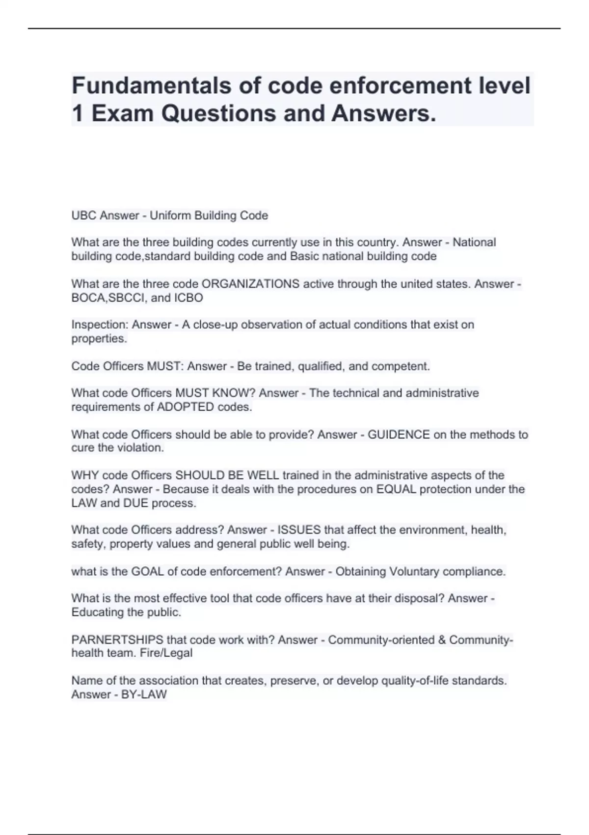 Fundamentals of code enforcement level 1 Exam Questions and Answers