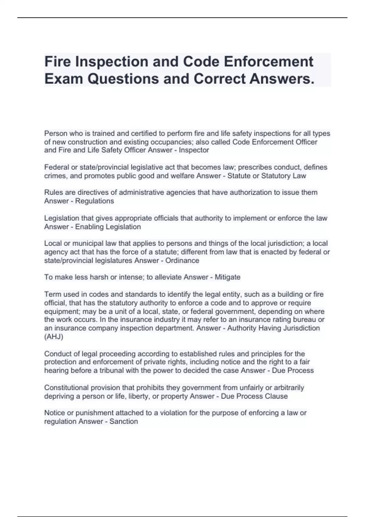 Fire Inspection and Code Enforcement Exam Questions and Correct Answers