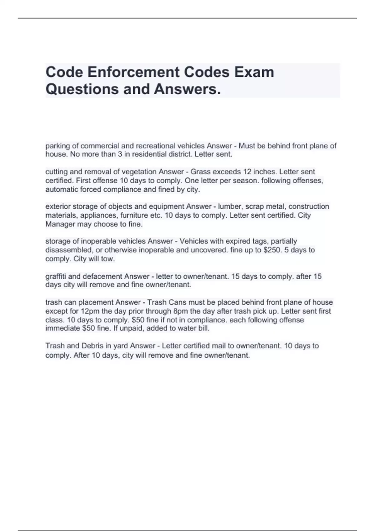 Code Enforcement Codes Exam Questions and Answers