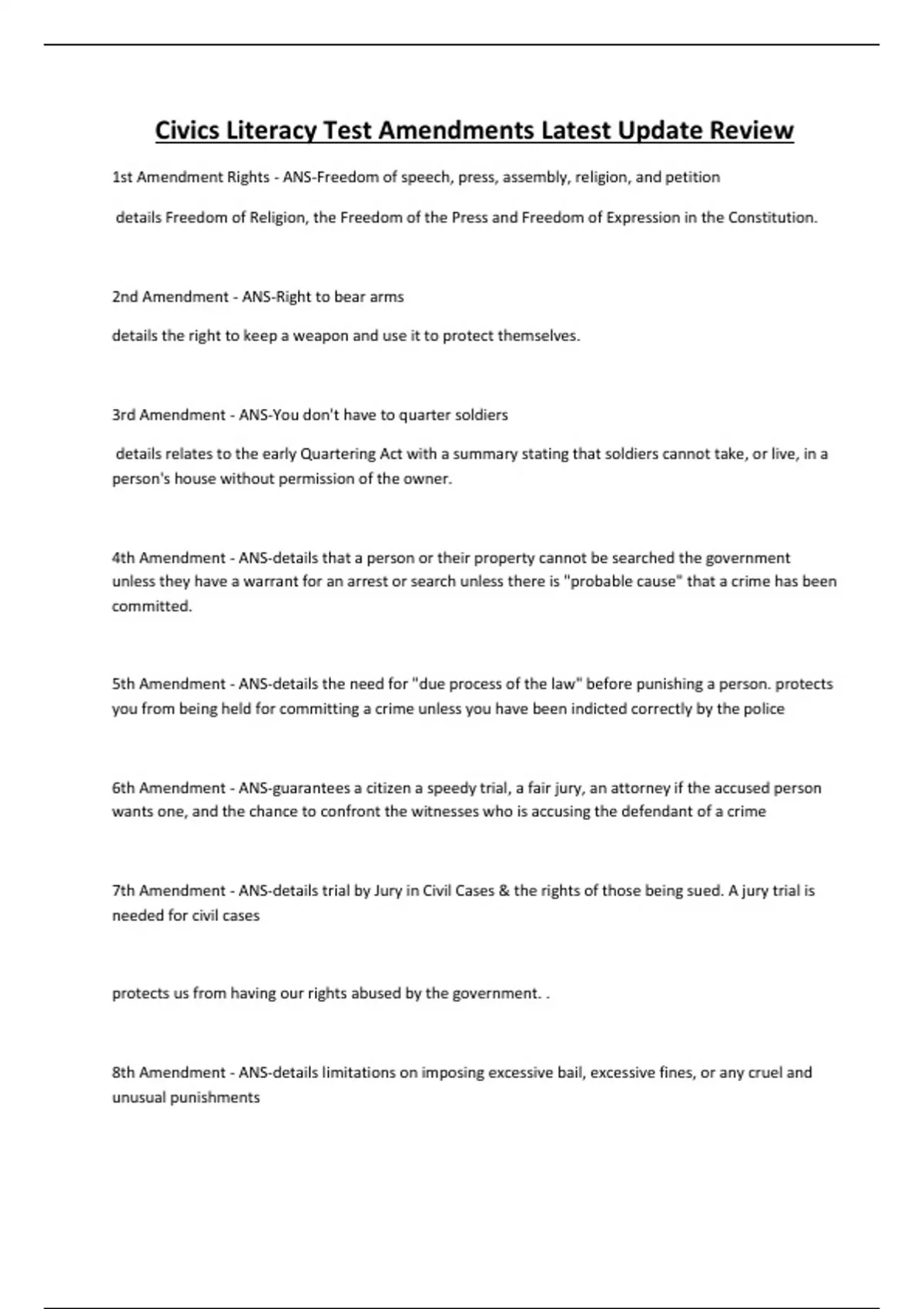 Civics Literacy Test Amendments Latest Update Review 1st Amendment Rights - ANS-Freedom of speech, press, assembly, religion, and petition details Freedom of Religion, the Freedom of the Press and Freedom of Expression in the Constitution. 2nd Amendment - ANS-Right to bear arms details the right to keep a weapon and use it to protect themselves. 3rd Amendment - ANS-You don't have to quarter soldiers details relates to the early Quartering Act with a summary stating that soldiers cannot take, or live, in a person's house without permission of the owner. 4th Amendment - ANS-details that a person or their property cannot be searched the government unless they have a warrant for an arrest or search unless there is "probable cause" that a crime has been committed. 5th Amendment - A