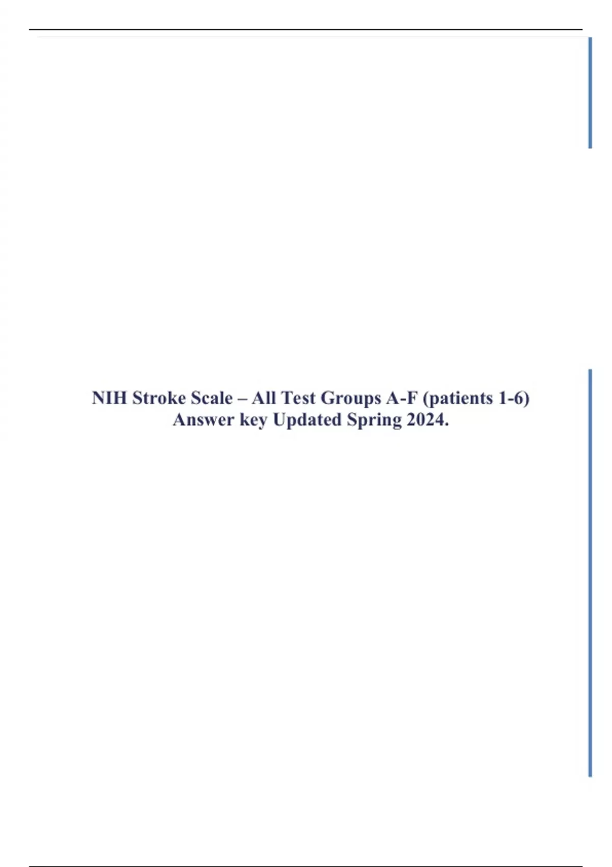 NIH Stroke Scale – All Test Groups A-F (patients 1-6) Answer key Updated Spring 2024. NIHSS - Group A Test Answers 2024/ NIHSS GROUP A | PATIENTS 1-6 NIH Stroke Scale Group B Patient 1-6 Answers (2024) NIHSS Group C - Patients 1-6 100% 2023 Passing answers. NIH Stroke Scale Group D Patient 1-6 Answers 2023. NIHSS-English Group E-V3 - 5th Certification (Answers 2024) NIH Stroke Scale Group F Patient 1-6 Answers 2024.