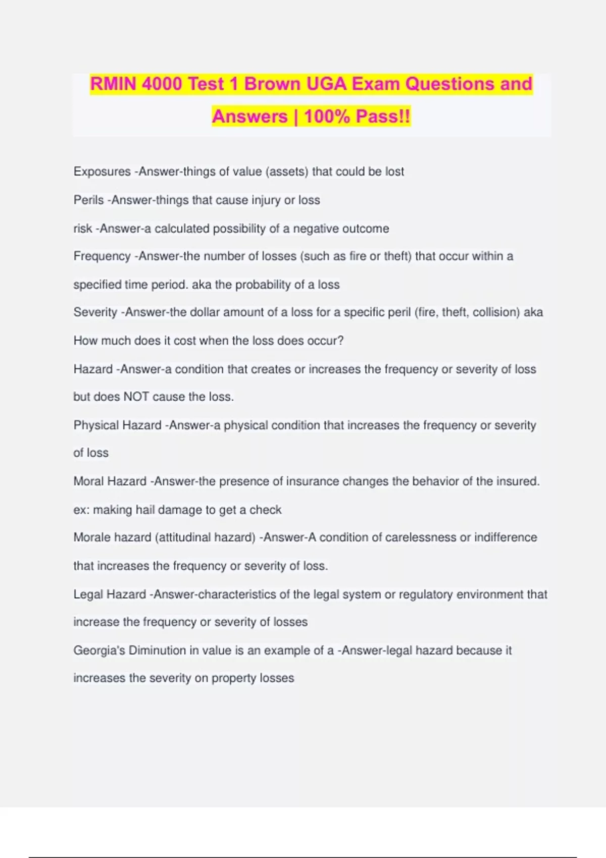 RMIN 4000 Test 1 Brown UGA Exam Questions and Answers | 100% Pass!! Exposures -Answer-things of value (assets) that could be lost Perils -Answer-things that cause injury or loss risk -Answer-a calculated possibility of a negative outcome Frequency -Answer-the number of losses (such as fire or theft) that occur within a specified time period. aka the probability of a loss Severity -Answer-the dollar amount of a loss for a specific peril (fire, theft, collision) aka How much does it cost when the loss does occur? Hazard -Answer-a condition that creates or increases the frequency or severity of loss but does NOT cause the loss. Physical Hazard -Answer-a physical condition that increases the frequency or severity of loss Moral Hazard -Answer-the presence of insurance changes the behavior of the insured. ex: making hail damage to get a check Morale hazard (attitudinal hazard) -Answer-A condition of carelessness or indifference that increases the frequency or severity of loss. Legal Hazard -Answer-characteristics of the legal system or regulatory environment that increase the frequency or severity of losses Georgia's Diminution in value is an example of a -Answer-legal hazard because it increases the severity on property losses Pure Risk -Answer-A chance of loss or no loss, but no chance of gain. Insurance can be bought for this Speculative Risk -Answer-A chance of loss, no loss, or gain. Diversifiable risk -Answer-a risk that affects only individuals or small groups and not the entire economy. It can be eliminated/ reduced through diversification. the risks are not correlated Developing cancer or your house being caught on fire are two examples of what kind of risk? -Answer-Pure Risk diversifiable risk -Answer-A risk that affects only some individuals, businesses, or small groups. they can be reduced/eliminated through diversification. the risks are not correlated Non-Diversifiable Risk -Answer-affects the entire economy or large numbers of persons or groups within the economy (hurricane, flood), risks are correlated (inflation, unemployment) cannot be eliminated through diversification Enterprise Risk -Answer-encompasses all major risks faced by a business firm, which include: pure risk, speculative risk, strategic risk, operational risk, and financial risk systemic risk -Answer-the risk that the failure of one financial institution can bring down other institutions as well. instability in the financial system due to the interdependency between the players in the market Types of Pure Risk -Answer-personal risks, property risks, liability risks, loss of business income, cyber-security risks