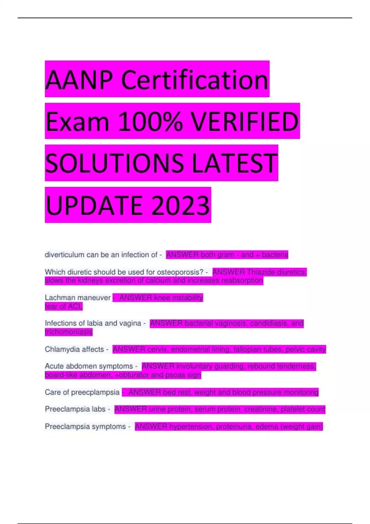 AANP Certification Exam 100% VERIFIED SOLUTIONS LATEST UPDATE 2023/2024 diverticulum can be an infection of - ANSWER both gram - and + bacteria Which diuretic should be used for osteoporosis? - ANSWER Thiazide diuretics: slows the kidneys excretion of calcium and increases reabsorption Lachman maneuver - ANSWER knee instability tear of ACL Infections of labia and vagina - ANSWER bacterial vaginosis, candidiasis, and trichomoniasis Chlamydia affects - ANSWER cervix, endometrial lining, fallopian tubes, pelvic cavity Acute abdomen symptoms - ANSWER involuntary guarding, rebound tenderness, board-like abdomen, +obturator and psoas sign Care of preecplampsia - ANSWER bed rest, weight and blood pressure monitoring Preeclampsia labs - ANSWER urine protein, serum protein, creatinine, platelet count Preeclampsia symptoms - ANSWER hypertension, proteinuria, edema (weight gain) Preeclampsia complications - ANSWER placental abruption, coagulopathy (DIC), renal failure, uteroplacental insufficiency, liver failure, hypertensive encephalopathy, retina l detachment, pulmonary edema, seizure, death community acquired pneumonia Most common bacteria least common bacteria Population treatment - ANSWER mycolpasma pneumoniae (atypical) h. influenza, strep pneumoniae atypical: psuedomonas aeruginosa college student, school children, military macrolides: azithromycin, clarithromycin Mantoux test - ANSWER Positive: 5mm Positive for recent immigrants: 10mm Murphy's sign - ANSWER biliary disorders deep inspiration by patient and deep palpation RUQ below costovertebral angle placenta previa - ANSWER implantation of the placenta over the cervical opening or in the lower region of the uterus painless bright red blood in the second or third trimester Order abdominal US Hashimoto's is most common in which population - ANSWER middle age to older women Hypertension Retinopathy - ANSWER AV nicking and copper or silver wire arterioles flame-shaped hemorrhages threatened abortion - ANSWER vaginal bleeding and cramping, soft uterus, cervix closed bacterial vaginosis - ANSWER fishy odor, milky white or dull gray discharge pH > 4.5 > 20% clue cells KOH whiff test squamous cells dotted with lots of bacteria that obscure borders - ANSWER clue cells Lichen sclerosis - ANSWER skin disease, white spots appear over time, most common genital and rectal most common in older woman itching, discomfort, bleeding order biopsy AV valves - ANSWER mitral and tricuspid semilunar valves - ANSWER pulmonary and aortic