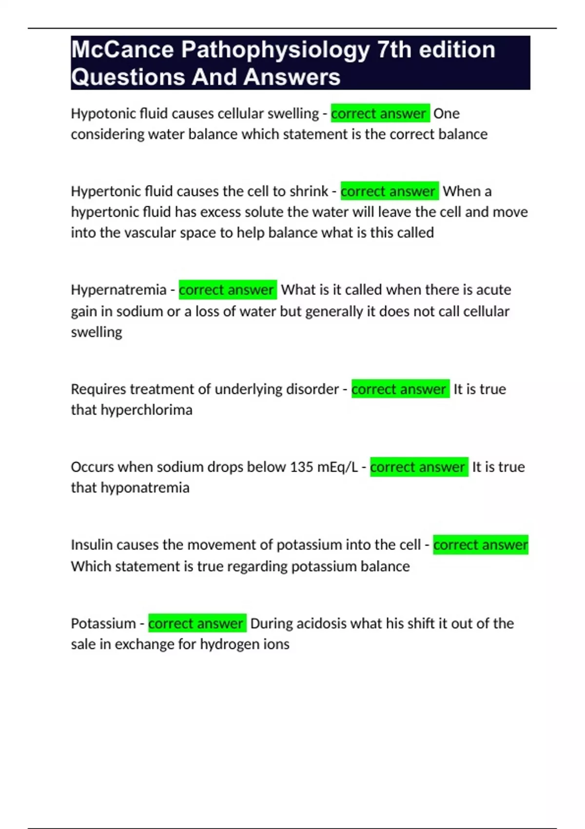 McCance Pathophysiology 7th edition Questions And Answers Hypotonic fluid causes cellular swelling - correct answer One considering water balance which statement is the correct balance