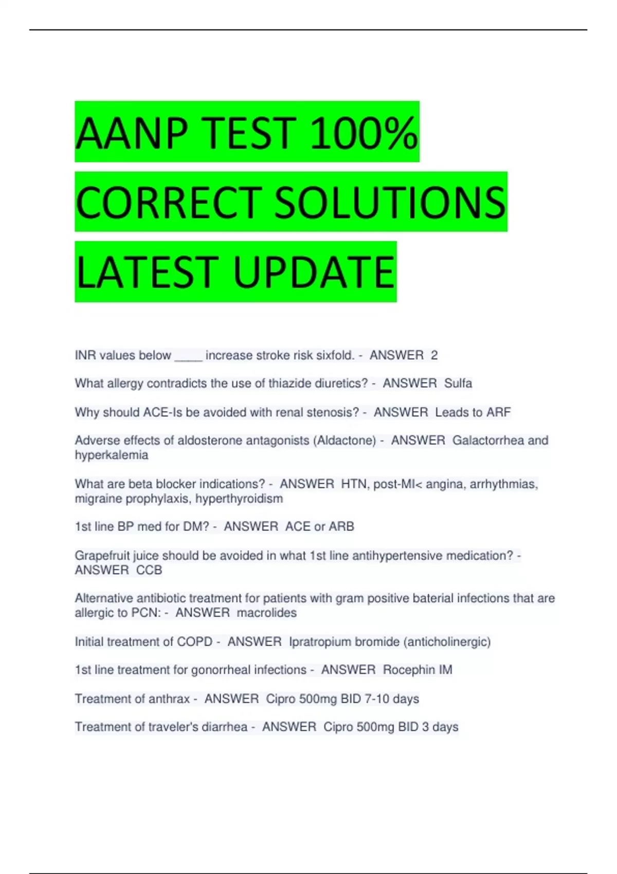 AANP TEST 100% CORRECT SOLUTIONS LATEST UPDATE2024 INR values below ____ increase stroke risk sixfold. - ANSWER 2 What allergy contradicts the use of thiazide diuretics? - ANSWER Sulfa Why should ACE-Is be avoided with renal stenosis? - ANSWER Leads to ARF Adverse effects of aldosterone antagonists (Aldactone) - ANSWER Galactorrhea and hyperkalemia What are beta blocker indications? - ANSWER HTN, post-MI< angina, arrhythmias, migraine prophylaxis, hyperthyroidism 1st line BP med for DM? - ANSWER ACE or ARB Grapefruit juice should be avoided in what 1st line antihypertensive medication? - ANSWER CCB Alternative antibiotic treatment for patients with gram positive baterial infections that are allergic to PCN: - ANSWER macrolides Initial treatment of COPD - ANSWER Ipratropium bromide (anticholinergic) 1st line treatment for gonorrheal infections - ANSWER Rocephin IM Treatment of anthrax - ANSWER Cipro 500mg BID 7-10 days Treatment of traveler's diarrhea - ANSWER Cipro 500mg BID 3 days What can increase the risk of tendon rupture when on a quinolone? - ANSWER age and steroids How long does ASA suppress platelet function? - ANSWER up to 7 days What is the FDA category and dose of finasteride? - ANSWER 5mg PO QD and category X What drug category should not be given with warfarin? - ANSWER sulfa drugs When should routine screening for breast cancer start? - ANSWER 40 If a patient had only one dose of the hep B vaccine what is recommended? - ANSWER Do not restart series; Start with 2nd dose What is done if a patient has a tetanus-prone wound and an unknown vaccination status? - ANSWER Administer immediate dose of Td and the teatnus immunoglobulin injection If a person is vaccinated with pneumovax prior to 65 what is recommended? - ANSWER Give a booster dose of pneumovax 5 years after initial dose When should Zostavax be given? - ANSWER age 60 How far apart should the varicella vaccines be given? - ANSWER 4 weeks Treatment for otitis externa - ANSWER Cortisporin otic drops Common bacterial pathogen of otitis externa - ANSWER Pseudomonas What is cholesteatoma a complication of? - ANSWER periorbital sinusitis What indicates an abnormal Rinne test? - ANSWER BC>AC What kind of hearing loss is found with an abnormal Rinne if BC>AC? - ANSWER conductive What kind of hearing loss is associated with lateralization to affected ear when Weber test is performed - ANSWER Conductive What kind of hearing loss is associated with lateralization to unaffected ear when Weber test is performed - ANSWER sensorurial What does 20/40 vision mean? - ANSWER A person can see 20 ft whereas normal vision can see 40 Common treatment of cerumenosis - ANSWER Carbamide peroxide What route should HIV esophageal candida infections - ANSWER Oral systemic Where is a scabies rash located? - ANSWER Interdigital webs and/or penis Antibiotic treatment for human, dog, or cat bite - ANSWER Augmentin A herald patch or "Christmas tree" pattern is associated with what disease? - ANSWER PItyriasis rosea What class of meds are used to treat PHN? - ANSWER TCAs What is the treatment for rosacea? - ANSWER Metronidazole gel What areas of the body have thicker skin and call for higher potency steroids? - ANSWER scalp, back, soles How do you check for pulsus paradoxus? - ANSWER BP cuff and stethoscope and the apical pulse What findings are associated with hypertensive retinopathy? - ANSWER copper and silver wire arterioles, AV nicking What findings are associated with diabetic retinopathy? - ANSWER