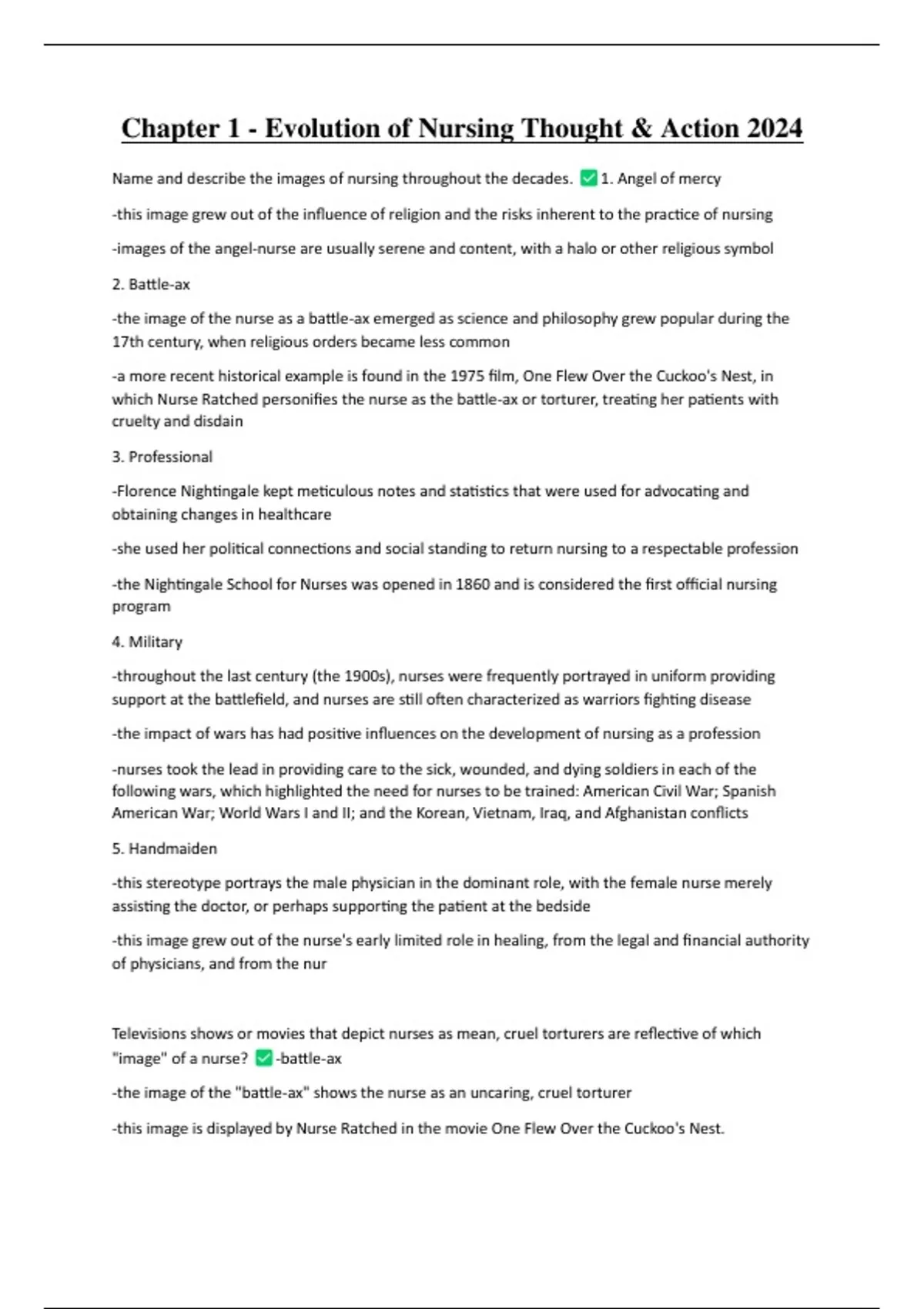Chapter 1 - Evolution of Nursing Thought & Action 2024 Name and describe the images of nursing throughout the decades. 1. Angel of mercy -this image grew out of the influence of religion and the risks inherent to the practice of nursing -images of the angel-nurse are usually serene and content, with a halo or other religious symbol 2. Battle-ax -the image of the nurse as a battle-ax emerged as science and philosophy grew popular during the 17th century, when religious orders became less common -a more recent historical example is found in the 1975 film, One Flew Over the Cuckoo's Nest, in which Nurse Ratched personifies the nurse as the battle-ax or torturer, treating her patients with cruelty and disdain 3. Professional -Florence Nightingale kept meticulous notes and statistics that were used for advocating and obtaining changes in healthcare -she used her political connections and social standing to return nursing to a respectable profession -the Nightingale School for Nurses was opened in 1860 and is considered the first official nursing program 4. Military -throughout the last century (the 1900s), nurses were frequently portrayed in uniform providing support at the battlefield, and nurses are still often characterized as warriors fighting disease -the impact of wars has had positive influences on the development of nursing as a profession -nurses took the lead in providing care to the sick, wounded, and dying soldiers in each of the following wars, which highlighted the need for nurses to be trained: American Civil War; Spanish American War; World Wars I and II; and the Korean, Vietnam, Iraq, and Afghanistan conflicts 5. Handmaiden -this stereotype portrays the male physician in the dominant role, with the female nurse merely assisting the doctor, or perhaps supporting the patient at the bedside -this image grew out of the nurse's early limited role in healing, from the legal and financial authority of physicians, and from the nur Televisions shows or movies that depict nurses as mean, cruel torturers are reflective of which "image" of a nurse? -battle-ax -the image of the "battle-ax" shows the nurse as an uncaring, cruel torturer -this image is displayed by Nurse Ratched in the movie One Flew Over the Cuckoo's Nest. Discuss how being caring was demonstrated in each of the images of the nurse throughout history. 1. Angel of mercy -this image grew out of the influence of religion and the risks inherent to the practice of nursing -images of the angel-nurse are usually serene and content, with a halo or other religious symbol 2. Battle-ax -the image of the nurse as a battle-ax emerged as science and philosophy grew popular during the 17th century, when religious orders became less common -in One Flew Over the Cuckoo's Nest, the nurse was cruel, treating her patients with disdain 3. Professional -the nurse advocates for and effects changes in healthcare -Nightingale used political connections and social standing to return nursing to a respectable profession -professionals are educated in schools 4. Military -portrayed as supporting patients at the battlefield -as warriors fighting disease -they took the lead in providing care to the sick, wounded, and dying -they were trained 5. Handmaiden -this was a subservient role to the superior, dominant male physician -the nurse merely assisted the doctor and/or supported the patient at the bedside -her role in healing was limited, and they were employees Relate each competency of "Provide goal-directed, client-centered care" to the actions of Florence Nightingale and her nurses. 1. Establish mutual goals with clients -wounded soldiers were partners in their care -nurses were in charge of the care and did not incorporate the soldier's wants or desires -this was a different time period and environmental conditions were not stellar 2. Show respect for client values, religious beliefs, needs, and preferences -same as 1^ 3. Implement interventions to promote client comfort -following Florence Nightingale's lead, the nurses' primary goal was to provide effective care and promote comfort of the soldiers -this is clearly depicted in the scenario and in the readings related to Florence Nightingale -there may be various views from students as to how this was accomplished 4. Provide client education to foster informed decisions and involvement in care and to facilitate post-discharge health -Florence Nightingale and the nurses educated the soldiers on the importance of fresh air, nutritious meals, good hygiene, etc Describe nursing today. 1. Nurses are competent and caring professionals 2. The complexity of healthcare delivery requires that nurses use critical thinking, communication, organization, leadership, advocacy, and technical skills to ensure that patients receive safe and effective care Name and describe thinking skills. 1. Clinical judgment -involves observing, comparing, contrasting, and evaluating the client's condition to determine whether change has occurred -it also involves careful consideration of the client's health status in light of what is expected based on the client's condition, medications, and treatment 2. Critical thinking -reflective thinking process that involves collecting information, analyzing the adequacy and accuracy of the information, and carefully considering options for action -nurses use critical thinking in every aspect of nursing care 3. Problem-solving -process by which nurses consider an issue and attempt to find a satisfactory solution to achieve the best outcomes -you will often use problem-solving in your professional life List the definitions of nursing. -American Nurses Association (ANA) 1980: the diagnosis and treatment of human responses to actual and potential health problems -ANA 2010: nursing practice is individualized -nurses care by establishing partnerships -caring is central to the practice of the RN -RNs use the nursing process to plan and provide individualized care to the healthcare consumers -a str