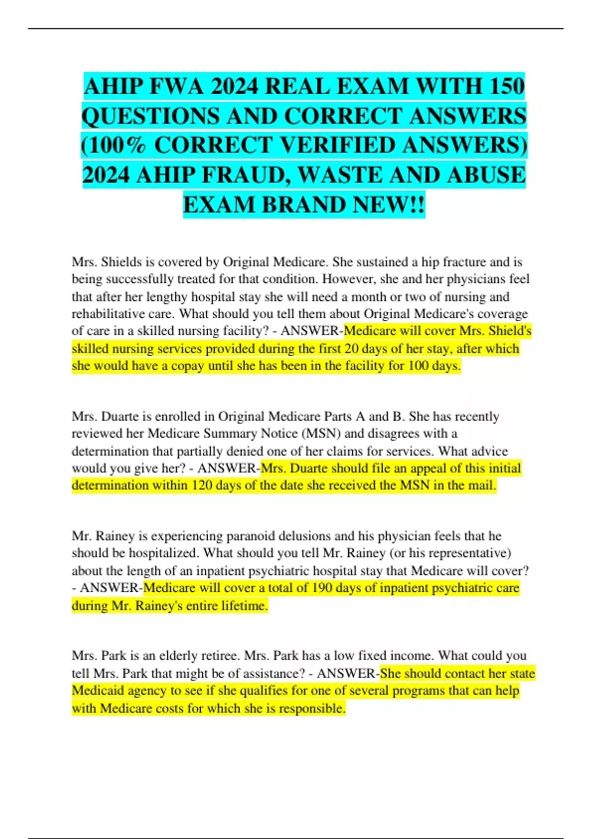 AHIP FWA 2024 REAL EXAM WITH 150 QUESTIONS AND CORRECT ANSWERS (100% CORRECT VERIFIED ANSWERS) 2024 AHIP FRAUD, WASTE AND ABUSE EXAM BRAND NEW!! Mrs. Shields is covered by Original Medicare. She sustained a hip fracture and is being successfully treated for that condition. However, she and her physicians feel that after her lengthy hospital stay she will need a month or two of nursing and rehabilitative care. What should you tell them about Original Medicare's coverage of care in a skilled nursing facility? - ANSWER-Medicare will cover Mrs. Shield's skilled nursing services provided during the first 20 days of her stay, after which she would have a copay until she has been in the facility for 100 days. Mrs. Duarte is enrolled in Original Medicare Parts A and B. She has recently reviewed her Medicare Summary Notice (MSN) and disagrees with a determination that partially denied one of her claims for services. What advice would you give her? - ANSWER-Mrs. Duarte should file an appeal of this initial determination within 120 days of the date she received the MSN in the mail. Mr. Rainey is experiencing paranoid delusions and his physician feels that he should be hospitalized. What should you tell Mr. Rainey (or his representative) about the length of an inpatient psychiatric hospital stay that Medicare will cover? - ANSWER-Medicare will cover a total of 190 days of inpatient psychiatric care during Mr. Rainey's entire lifetime.