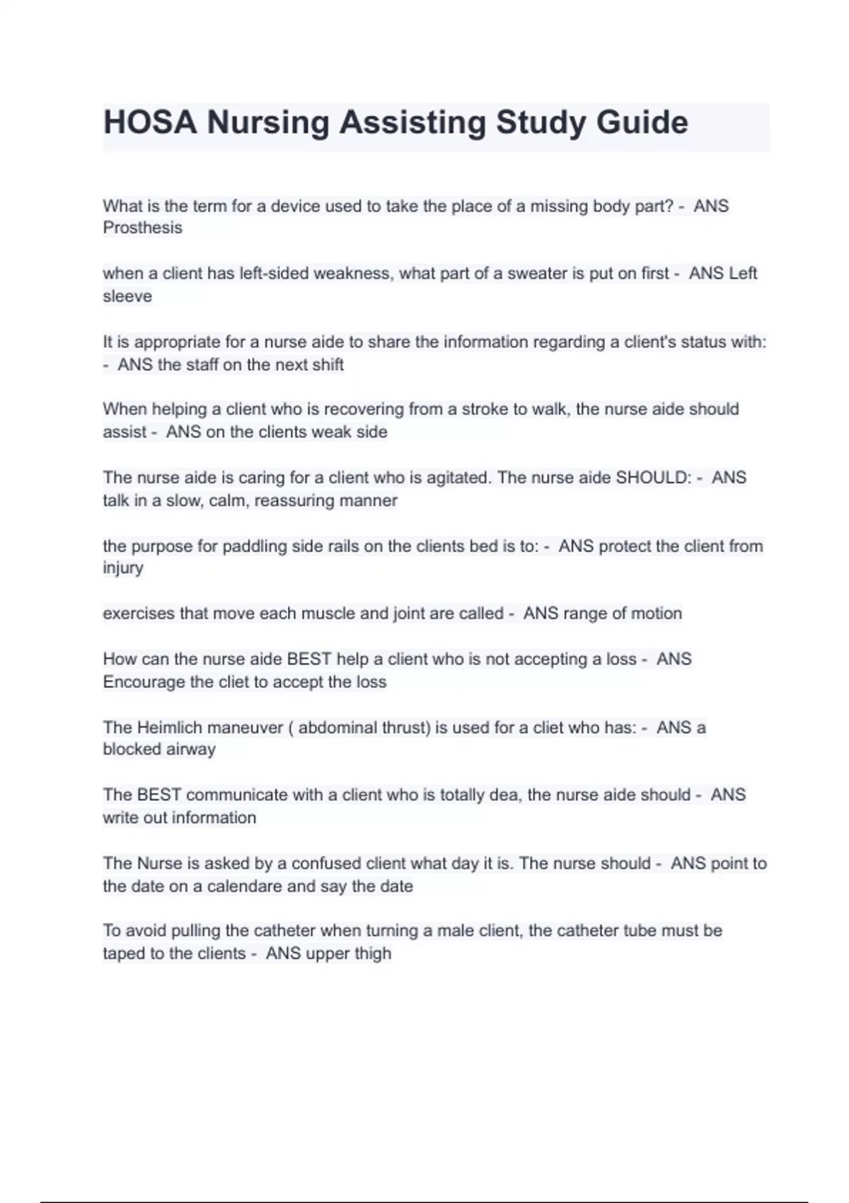 HOSA Nursing Assisting Study Guide Questions And Answers A GRADED
