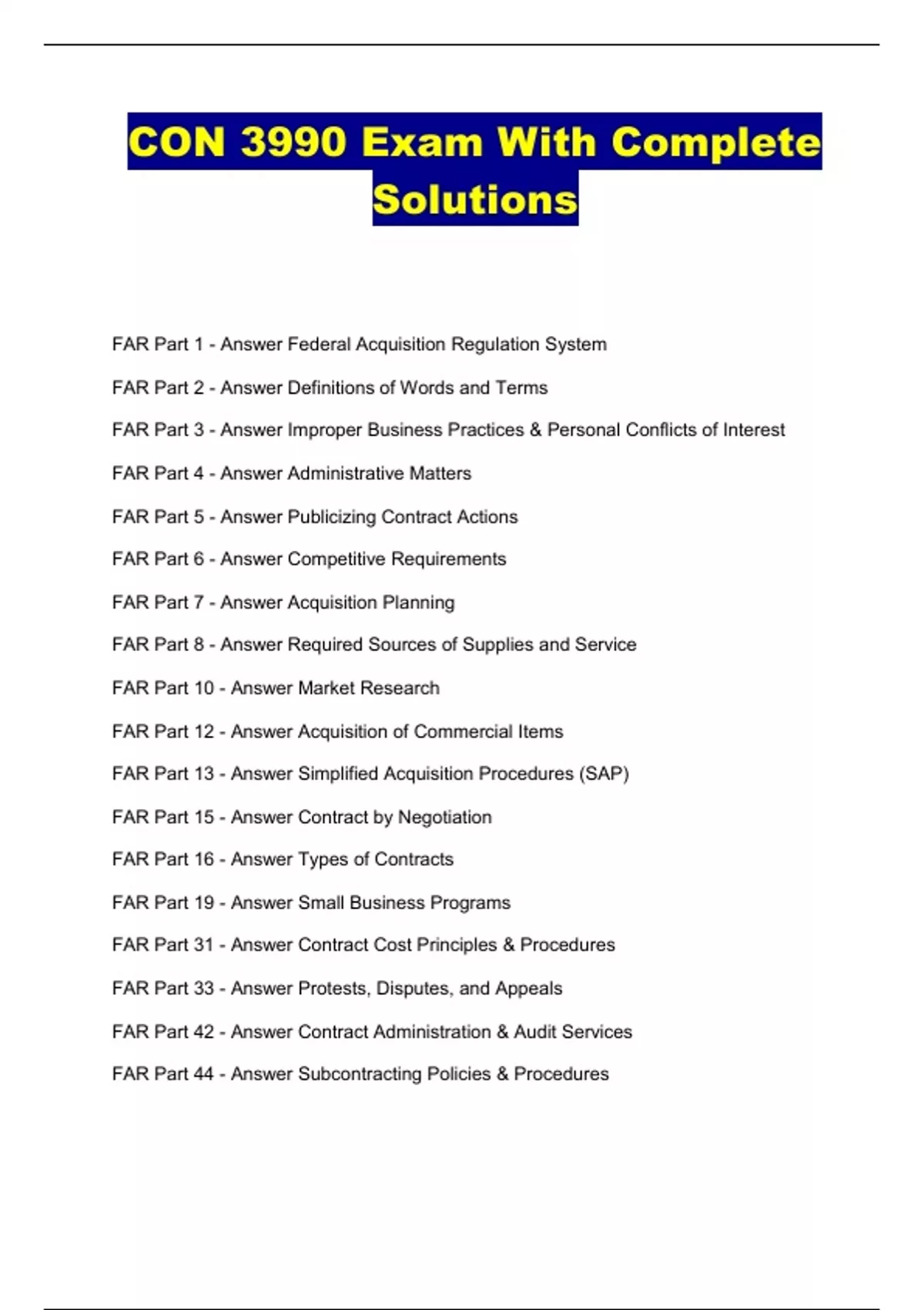 FAR Part 1 - Answer Federal Acquisition Regulation System FAR Part 2 - Answer Definitions of Words and Terms FAR Part 3 - Answer Improper Business Practices & Personal Conflicts of Interest FAR Part 4 - Answer Administrative Matters FAR Part 5 - Answer Publicizing Contract Actions FAR Part 6 - Answer Competitive Requirements FAR Part 7 - Answer Acquisition Planning FAR Part 8 - Answer Required Sources of Supplies and Service FAR Part 10 - Answer Market Research FAR Part 12 - Answer Acquisition of Commercial Items FAR Part 13 - Answer Simplified Acquisition Procedures (SAP) FAR Part 15 - Answer Contract by Negotiation FAR Part 16 - Answer Types of Contracts FAR Part 19 - Answer Small Business Programs FAR Part 31 - Answer Contract Cost Principles & Procedures FAR Part 33 - Answer Protests, Disputes, and Appeals FAR Part 42 - Answer Contract Administration & Audit Services FAR Part 44 - Answer Subcontracting Policies & ProceduresFAR Part 46 - Answer Quality Assurance FAR Part 49 - Answer Termination of Contracts
