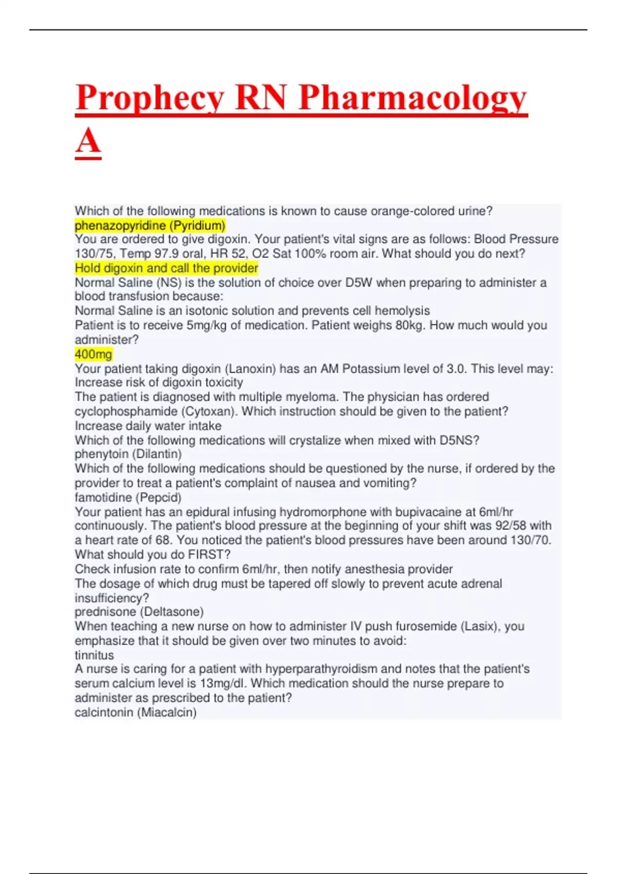 Normal Saline is an isotonic solution and prevents cell hemolysis Patient is to receive 5mg/kg of medication. Patient weighs 80kg. How much would you administer? 400mg Your patient taking digoxin (Lanoxin) has an AM Potassium level of 3.0. This level may: Increase risk of digoxin toxicity The patient is diagnosed with multiple myeloma. The physician has ordered cyclophosphamide (Cytoxan). Which instruction should be given to the patient? Increase daily water intake Which of the following medications will crystalize when mixed with D5NS? phenytoin (Dilantin)