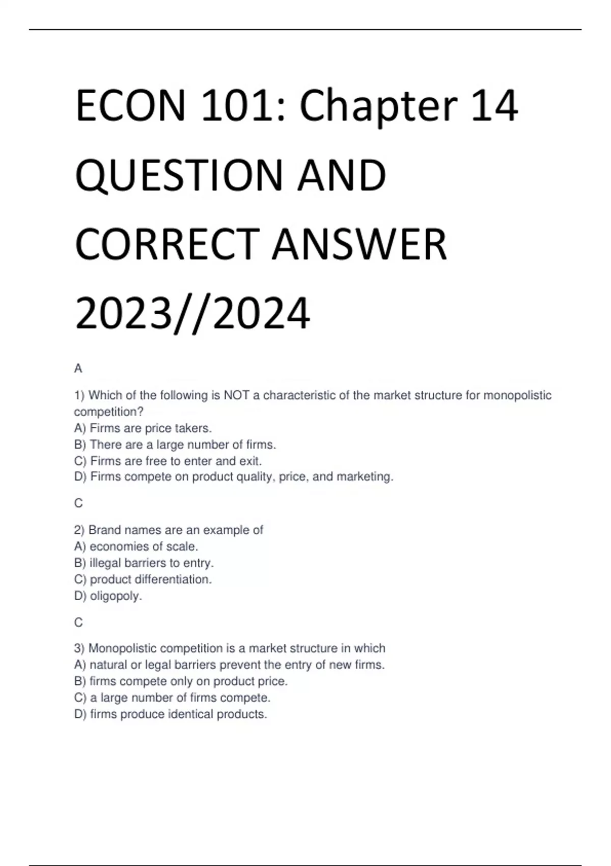 ECON 101: Chapter 14 QUESTION AND CORRECT ANSWER 2023//2024 A 1) Which of the following is NOT a characteristic of the market structure for monopolistic competition? A) Firms are price takers. B) There are a large number of firms. C) Firms are free to enter and exit. D) Firms compete on product quality, price, and marketing. C 2) Brand names are an example of A) economies of scale. B) illegal barriers to entry. C) product differentiation. D) oligopoly. C 3) Monopolistic competition is a market structure in which A) natural or legal barriers prevent the entry of new firms. B) firms compete only on product price. C) a large number of firms compete. D) firms produce identical products. C 4) All of the following characteristics apply to monopolistic competition EXCEPT A) firms compete on product quality, price, and marketing. B) there are no barriers to enter or exit the industry. C) each firm produces the same identical product. D) a large number of firms compete. D 5) In monopolistic competition, each firm supplies a ________ part of the total market output and its actions ________ the actions of the other firms. A) small; directly affect B) large; directly affect C) large; do not directly affect D) small; do not directly affect A 6) A monopolistically competitive firm is like a monopoly firm insofar as A) both have MR curves that lie below their demand curves. B) neither is protected by high barriers to entry. C) both earn an economic profit in the long run. D) both face perfectly elastic demand. C 7) When comparing perfect competition and monopolistic competition, we find that A) firms in monopolistic competition face barriers to entry, unlike firms in perfect competition. B) firms in monopolistic competition produce identical products just as do firms in perfect competition. C) advertising plays a large role in monopolistic competition, unlike in perfect competition. D) firms in monopolistic competition are price takers just as is the case for firms in perfect competition. C 8) Which of the following is NOT true of monopolistic competition? A) There are a large number of firms. B) Firms can compete on price and quality. C) Firms produce a good that is a perfect substitute for their competitors' goods. D) There is free entry and exit. A 9) One difference between perfect competition and monopolistic competition is that A) firms in monopolistic competition face a downward-sloping demand curve. B) monopolistic competition has barriers to entry. C) a perfectly competitive industry has fewer firms. D) in perfect competition, firms produce slightly differentiated products. B 10) Brand name drugs are chemically identical to their generic counterparts. Yet, consumers often prefer the brand name product to the generic product. Making consumers think that a brand name drug differs from its generic counterpart is an example of A) perfect competition. B) product differentiation. C) oligopolistic behavior. D) price taking behavior. B 11) The best example of a g