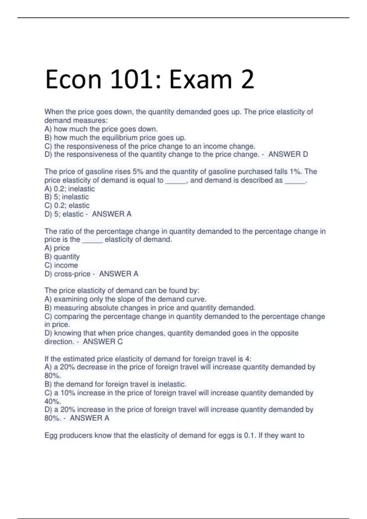 Econ 101: Exam 2 When the price goes down, the quantity demanded goes up. The price elasticity of demand measures: A) how much the price goes down. B) how much the equilibrium price goes up. C) the responsiveness of the price change to an income change. D) the responsiveness of the quantity change to the price change. - ANSWER D The price of gasoline rises 5% and the quantity of gasoline purchased falls 1%. The price elasticity of demand is equal to _____, and demand is described as _____. A) 0.2; inelastic B) 5; inelastic C) 0.2; elastic D) 5; elastic - ANSWER A The ratio of the percentage change in quantity demanded to the percentage change in price is the _____ elasticity of demand. A) price B) quantity C) income D) cross-price - ANSWER A The price elasticity of demand can be found by: A) examining only the slope of the demand curve. B) measuring absolute changes in price and quantity demanded. C) comparing the percentage change in quantity demanded to the percentage change in price. D) knowing that when price changes, quantity demanded goes in the opposite direction. - ANSWER C If the estimated price elasticity of demand for foreign travel is 4: A) a 20% decrease in the price of foreign travel will increase quantity demanded by 80%. B) the demand for foreign travel is inelastic. C) a 10% increase in the price of foreign travel will increase quantity demanded by 40%. D) a 20% increase in the price of foreign travel will increase quantity demanded by 80%. - ANSWER A Egg producers know that the elasticity of demand for eggs is 0.1. If they want to increase sales by 5%, they will have to lower price by: A) 0.1%. B) 1%. C) 5%. D) 50%. - ANSWER D Gas prices recently increased by 25%. In response, purchases of gasoline decreased by 5%. According to this finding, the price elasticity of demand for gas is: A) 5. B) 2. C) 0.2. D) 0.5. - ANSWER C The only producer of chocolate bunnies in the world, Choco's Bunny Company, recently expanded its production capacity from 1,000 to 2,000 bunnies per day. If the price elasticity of demand for bunnies is 3.33, by how much will the company have to reduce its price to sell the additional 1,000 bunnies (by the midpoint method)? A) 2.5% B) 25% C) 125% D) 20% - ANSWER D Use of the midpoint method to calculate the price elasticity of demand eliminates the problem of computing: A) different elasticities, depending on whether price decreases or increases. B) different elasticities, because price and quantity are inversely related on the demand curve. C) total revenue when price falls and demand is inelastic. D) total revenue when price falls and demand is elastic. - ANSWER A Each month Jessica buys exactly 15 Big Macs regardless of the price. Jessica's price elasticity of demand for Big Macs is: A) 0. B) 1. C) greater than 1. D) less than 1 but greater than 0. - ANSWER A Suppose the price elasticity of demand for cheeseburgers equals 0.37. This means the overall demand for cheeseburgers is: A) price elastic. B) price inelastic. C) price unit-elastic. D) perfectly price inelastic - ANSWER B The price elasticity of demand for skiing lessons in New Hampshire is over 1. This means that the demand is _____ in New Hampshire. A) price elastic B) price inelastic C) price unit-elastic. D) perfectly price elastic - ANSWER A A major state university in the South recently raised tuition by 12%. An economics professor at this university asked his students, "How many of you will transfer to another university because of the increase in tuition?" One student in about 300 said that he or she would transfer. Based on this information, the price elasticity of demand for education at this university is: A) 1. B) highly elastic. C) highly inelastic. D) 0. - ANSWER C