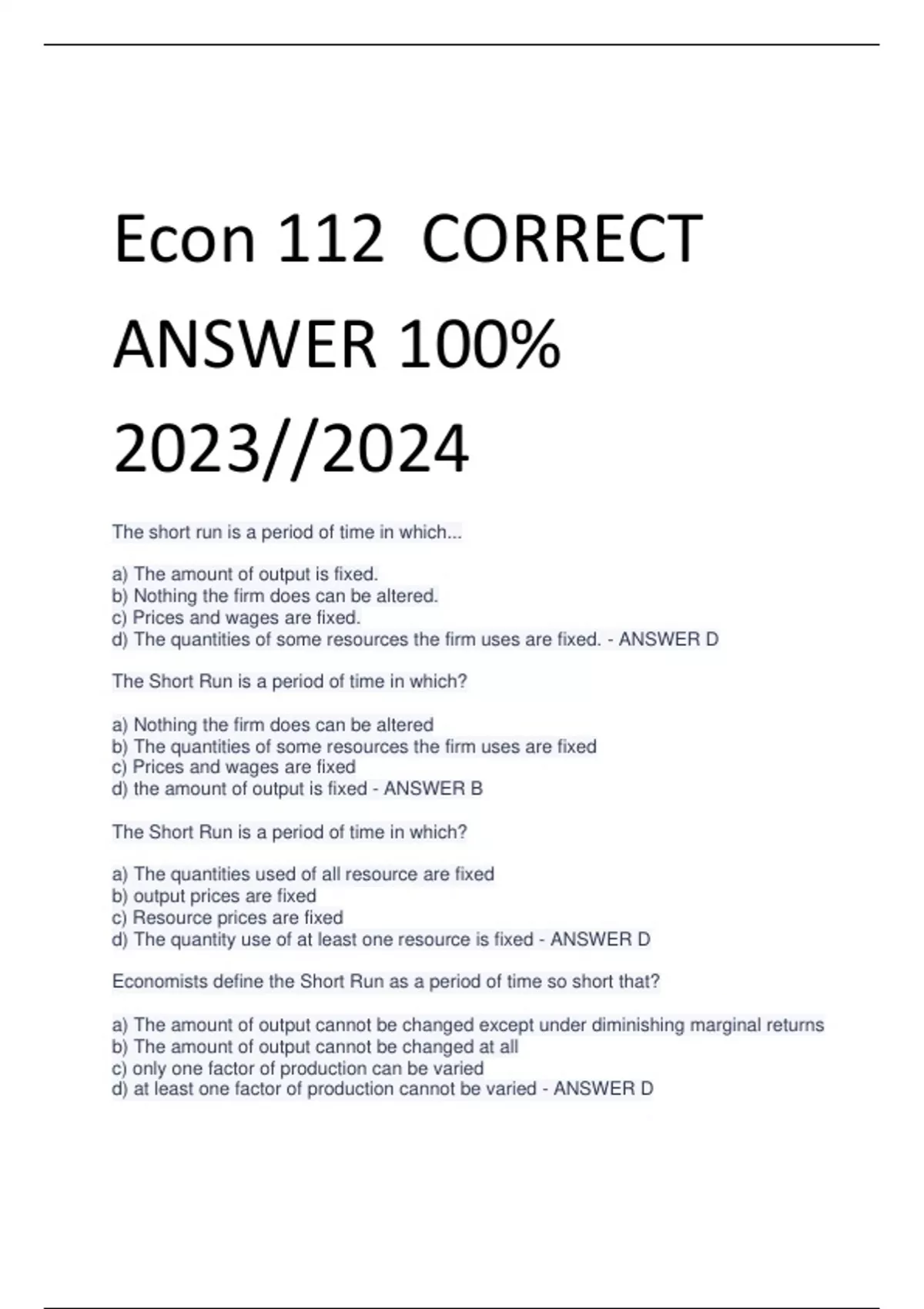 Econ 112 CORRECT ANSWER 100% 2023//2024 The short run is a period of time in which... a) The amount of output is fixed. b) Nothing the firm does can be altered. c) Prices and wages are fixed. d) The quantities of some resources the firm uses are fixed. - ANSWER D The Short Run is a period of time in which? a) Nothing the firm does can be altered b) The quantities of some resources the firm uses are fixed c) Prices and wages are fixed d) the amount of output is fixed - ANSWER B The Short Run is a period of time in which? a) The quantities used of all resource are fixed b) output prices are fixed c) Resource prices are fixed d) The quantity use of at least one resource is fixed - ANSWER D Economists define the Short Run as a period of time so short that? a) The amount of output cannot be changed except under diminishing marginal returns b) The amount of output cannot be changed at all c) only one factor of production can be varied d) at least one factor of production cannot be varied - ANSWER D The Short Run is a time period during which... a) All factors of production are fixed b) All factors of production are variable c) A firm can earn a normal profit d) at least one factor of production is fixed - ANSWER D An example of a variable resource in the short run is? a) an employee b) capital equipment c) a building d) land - ANSWER A When the demand for electricity peaks during the hottest days of summer, Florida Power and Light Company can generate more electricity by using more fuel and increasing the working hours of many of its employees. The company cannot, however, increase electric power production by building additional generating capacity. This means that the company is in the a) Market run b) Long Run c) Intermediate run d) Short Run - ANSWER D An example of a short-run fixed factor of production is? a) Postage for mailing b) Capital equipment c) Electricity d) Labor - ANSWER B The long run is a time frame in which? a)The quantities of all resources are fixed b) All costs are sunk costs. c) The quantities of some resources are fixed and the quantities of other resources can be varied. d) The quantities of all resources can be varied. - ANSWER D A period of time in which the quantity of all factors of production used by a firm can be varied is called the? a) Long run. b) Market period. c) Short run. d) Variable run. - ANSWER A In the long run, a firm has? a) Fixed factors of production but no variable resources. b) No factors of production that are variable. c) No factors of production that are either fixed or variable. d) No factors of production that are fixed. - ANSWER D The long run a) Means a long period of time, always longer than a year. b) Is a period of time in which all factors of production can be varied. c) Is different for different firms. d) Both answers B and C are correct. - ANSWER D The long run is a period of time in which? a) Some but not all factors of production are fixed. b) All factors of production are fixed. c) All factors of production are variable. d) Some but not all factors of production are variable. - ANSWER C In the long run, a firm can vary... a) Its capital but not its labor. b) Its labor but not its capital. c) Neither its labor nor its capita