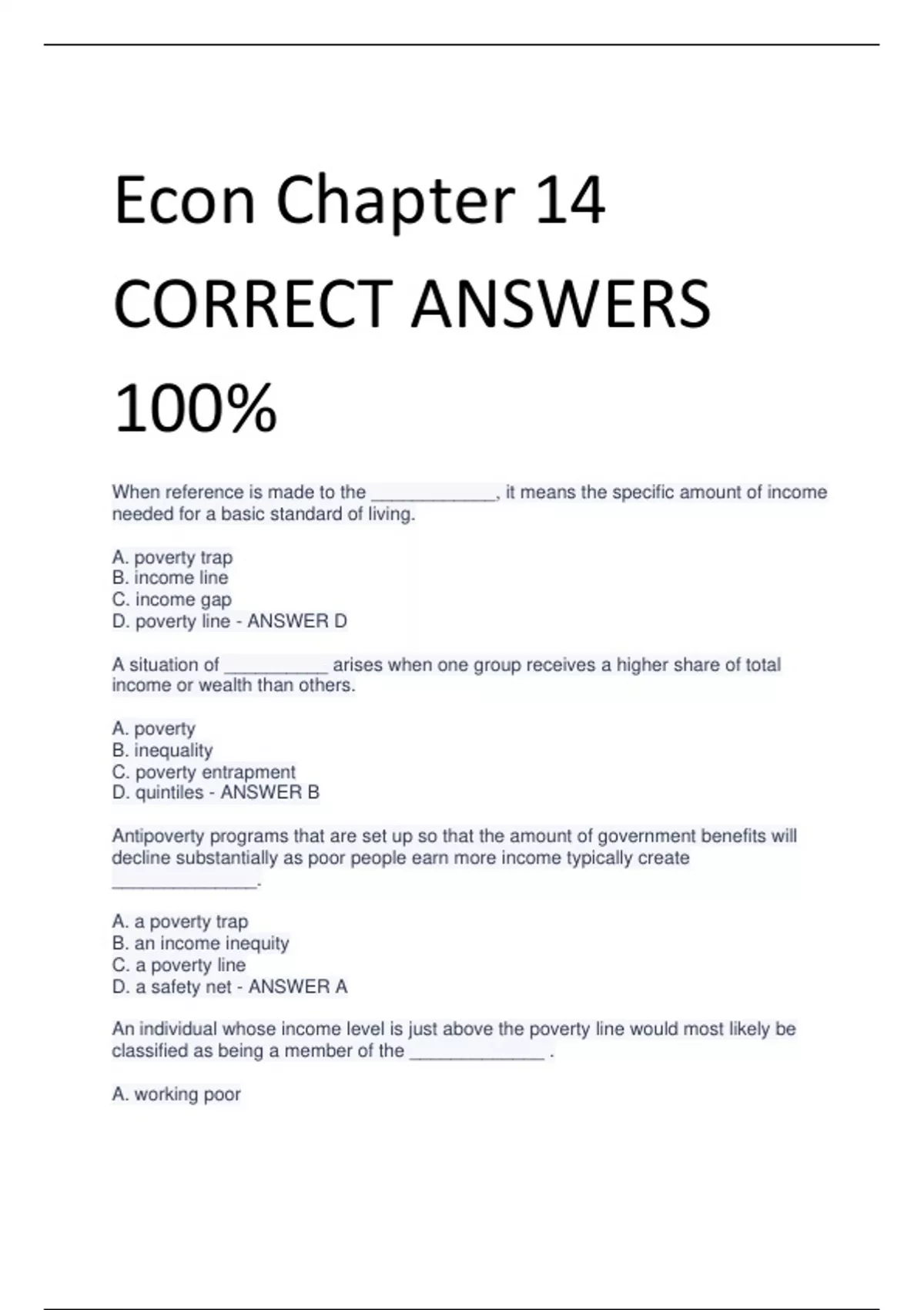 Econ Chapter 14 CORRECT ANSWERS 100% When reference is made to the ____________, it means the specific amount of income needed for a basic standard of living. A. poverty trap B. income line C. income gap D. poverty line - ANSWER D A situation of __________ arises when one group receives a higher share of total income or wealth than others. A. poverty B. inequality C. poverty entrapment D. quintiles - ANSWER B Antipoverty programs that are set up so that the amount of government benefits will decline substantially as poor people earn more income typically create ______________. A. a poverty trap B. an income inequity C. a poverty line D. a safety net - ANSWER A An individual whose income level is just above the poverty line would most likely be classified as being a member of the _____________ . A. working poor B. poverty trapped C. near-poor D. illiterate poor - ANSWER C The group of government programs that provide assistance to the poor and the nearpoor is synonymous with which of the following? A. safety net B. safety quintiles C. poverty net D. antipoverty net - ANSWER A A method often used by economists to look at distribution of income in a society's economy involves A. programs for wealth redistribution. B. quintiles, or dividing a whole group into fifths. C. imposing taxes to redistribute wealth. D. quads, or dividing a whole group into fourths. - ANSWER B A Lorenz curve refers to a graphic illustration of the share of population on the _______________ and the cumulative percentage of total income received on the __________________ . A. left quintile; right quintile B. right quintile; left quintile C. horizontal axis; vertical axis D. vertical axis; horizontal axis - ANSWER C In circumstances dealing with poverty, the term ______________ means taking income from those with higher incomes and providing income to those with lower incomes. A. safety net B. estate tax C. minimum wage D. redistribution - ANSWER D ______________ allows the government to collect wealth for redistribution based on the amount of stored wealth that is being passed on in the form of an inheritance. A. An inheritance tax B. A redistribution tax C. An estate tax D. A death tax - ANSWER C With respect to market forces and/or labor markets that determine peoples' wages, which of the following is a true statement? A. labor markets consider how much a family needs for health care B. market forces consider what happens to families in their business decisions C. labor markets consider how much a family needs for necessities D. labor markets create considerable inequalities relating to income - ANSWER D _________________ is the level where half of all families had more than that level and half had less. A. The first quintile B. The third quintile C. The median D. The quintile - ANSWER C In the U.S., comparisons of high and low incomes raise issues of economic ______________________. A. inequality and poverty B. equality and wealth distribution C. wealth distribution and poverty D. equality and inequality - ANSWER A Poverty is measured