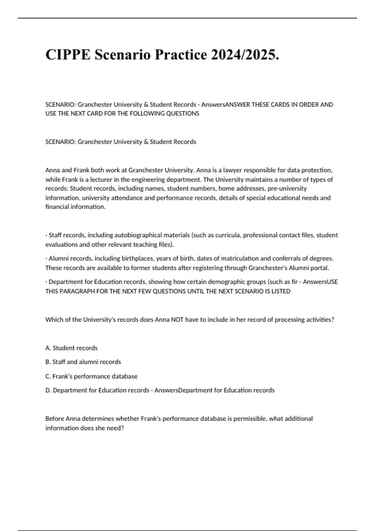 SCENARIO: Granchester University & Student Records - AnswersANSWER THESE CARDS IN ORDER AND USE THE NEXT CARD FOR THE FOLLOWING QUESTIONS SCENARIO: Granchester University & Student Records Anna and Frank both work at Granchester University. Anna is a lawyer responsible for data protection, while Frank is a lecturer in the engineering department. The University maintains a number of types of records: Student records, including names, student numbers, home addresses, pre-university information, university attendance and performance records, details of special educational needs and financial information. · Staff records, including autobiographical materials (such as curricula, professional contact files, student evaluations and other relevant teaching files). · Alumni records, including birthplaces, years of birth, dates of matriculation and conferrals of degrees. These records are available to former students after registering through Granchester's Alumni portal. · Department for Education records, showing how certain demographic groups (such as fir - AnswersUSE THIS PARAGRAPH FOR THE NEXT FEW QUESTIONS UNTIL THE NEXT SCENARIO IS LISTED Which of the University's records does Anna NOT have to include in her record of processing activities? A. Student records B. Staff and alumni records C. Frank's performance database D. Department for Education records - AnswersDepartment for Education records Before Anna determines whether Frank's performance database is permissible, what additional information does she need? A. More information about Frank's data protection training. B. More information about the extent of the information loss. C. More information about the algorithm Frank used to mask student numbers. D. More information about what students have been told and how the research will be used. - AnswersMore information about what students have been told and how the research will be used. Anna will find that a risk analysis is NOT necessary in this situation as long as? A. The data subjects are no longer current students of Frank's B. The processing will not negatively affect the rights of the data subjects C. The algorithms that Frank uses for the processing are technologically sound D. The data subjects gave their unambiguous consent for the original processing - AnswersThe processing will not negatively affect the rights of the data subjects SCENARIO: THE TOY MANUFACTURER - AnswersANSWER THESE CARDS IN ORDER AND USE THE NEXT CARD FOR THE FOLLOWING QUESTIONS SCENARIO: THE TOY MANUFACTURER You have just been hired by a toy manufacturer based in Hong Kong. The company sells a broad range of dolls, action figures and plush toys that can be found internationally in a wide variety of retail stores. Although the manufacturer has no offices outside Hong Kong and in fact does not employ any staff outside Hong Kong, it has entered into a number of local distribution contracts. The toys produced by the company can be found in all popular toy stores throughout Europe, the United States and Asia. A large portion of the company's revenue is due to international sales. The company now wishes to launch a new range of connected toys, ones that can talk and interact with children. The CEO of the company is touting these toys as the next big thing, due to the increased possibilities offered: The figures can answer children's questions on various subjects, such as mathematical calculatio - AnswersUSE THIS PARAGRAPH FOR THE NEXT FEW QUESTIONS UNTIL THE NEXT SCENARIO IS LISTED Why is this company obligated to comply with the GDPR? A. The company has offices in the EU. B. The company employs staff in the EU. C. The company's data center is located in a country outside the EU. D. The company's products are marketed directly to EU customers. - AnswersThe company's products are marketed directly to EU customers. What presents the BIGGEST potential privacy issue with the company's practices? A. The NFC portal can read any data stored in the action figures B. The information about the data processing involved has not been specified C. The cloud service provider is in a country that has not been deemed adequate D. The RFID tag in the action figures has the potential for misuse because of the toy's evolving capabilities - AnswersThe information about the data processing involved has not been specified To ensure GDPR compliance, what should be the company's position on the issue of consent? A. The child, as the user of the action figure, can provide consent himself, as long as no information is shared for marketing purposes. B. Written authorization attesting to the responsible use of children's data would need to be obtained from the supervisory authority. C. Consent for data collection is implied through the parent's purchase of the action figure for the child. D. Parental consent for a child's use of the action figures would have to be obtained before any data could be collected. - AnswersParental consent for a child's use of the action figures would have to be obtained before any data could be collected. In light of the requirements of Article 32 of the GDPR (related to the Security of Processing), which practice should the company institute? A. Encrypt the data in transit over the wireless Bluetooth connection. B. Include dual-factor authentication before each use by a child in order to ensure a minimum amount of security. C. Include three-factor authentication before each use by a child in order to ensure the best level of security possible. D. Insert contractual clauses into the contract between the toy manufacturer and the cloud service provider, since South Africa is outside the European Union. - AnswersEncrypt the data in transit over the wireless Bluetooth connection. SCENARIO: THE INSURANCE COMPANY CUSTOMER - AnswersANSWER THESE CARDS IN ORDER AND USE THE NEXT CARD FOR THE FOLLOWING QUESTIONS SCENARIO: THE INSURANCE COMPANY CUSTOMER Jason, a long-time customer of ABC insurance, was involved in a minor car