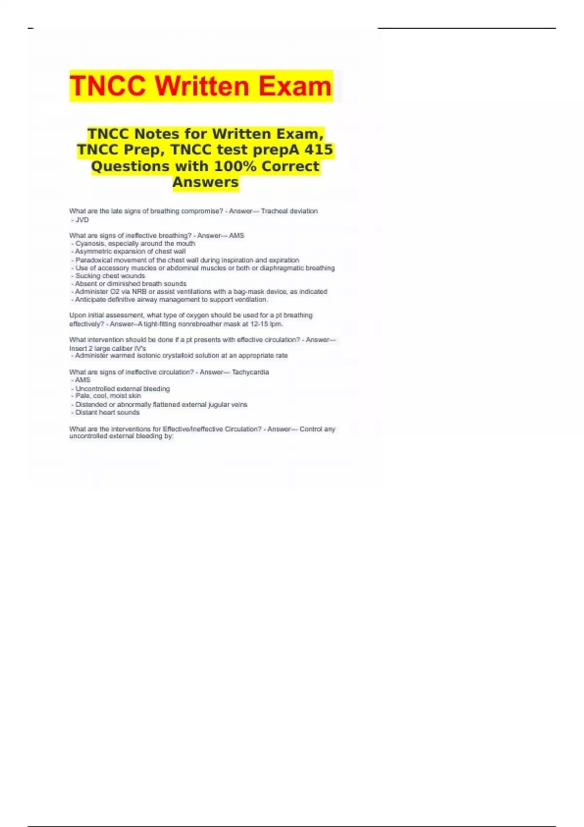 TNCC Notes for Written Exam, TNCC Prep, TNCC test prepA 415 Questions with 100% Correct Answers