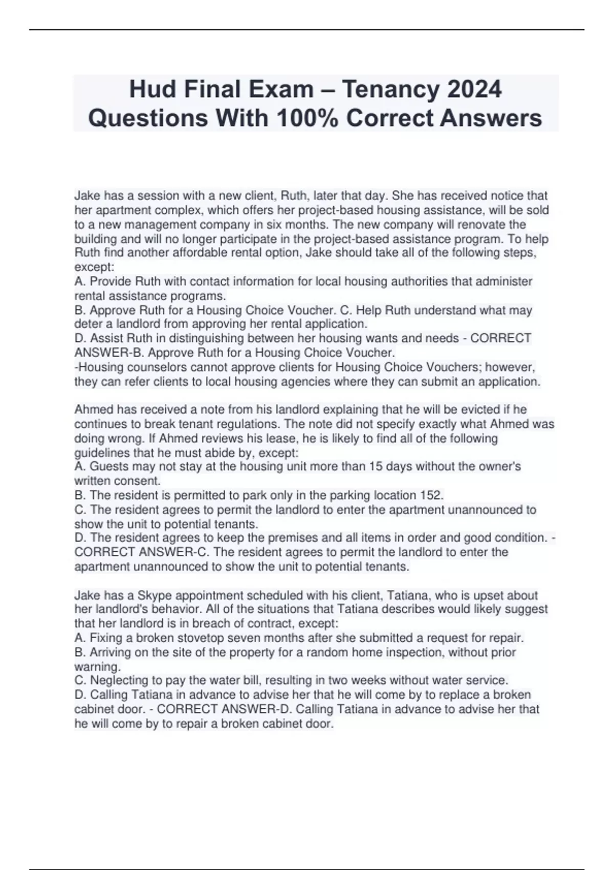 Hud Final Exam – Tenancy 2024 Questions With 100% Correct Answers Jake has a session with a new client, Ruth, later that day. She has received notice that her apartment complex, which offers her project-based housing assistance, will be sold to a new management company in six months. The new company will renovate the building and will no longer participate in the project-based assistance program. To help Ruth find another affordable rental option, Jake should take all of the following steps, except: A. Provide Ruth with contact information for local housing authorities that administer rental assistance programs. B. Approve Ruth for a Housing Choice Voucher. C. Help Ruth understand what may deter a landlord from approving her rental application. D. Assist Ruth in distinguishing between her housing wants and needs - CORRECT ANSWER-B. Approve Ruth for a Housing Choice Voucher. -Housing counselors cannot approve clients for Housing Choice Vouchers; however, they can refer clients to local housing agencies where they can submit an application. Ahmed has received a note from his landlord explaining that he will be evicted if he continues to break tenant regulations. The note did not specify exactly what Ahmed was doing wrong. If Ahmed reviews his lease, he is likely to find all of the following guidelines that he must abide by, except: A. Guests may not stay at the housing unit more than 15 days without the owner's written consent. B. The resident is permitted to park only in the parking location 152. C. The resident agrees to permit the landlord to enter the apartment unannounced to show the unit to potential tenants. D. The resident agrees to keep the premises and all items in order and good condition. - CORRECT ANSWER-C. The resident agrees to permit the landlord to enter the apartment unannounced to show the unit to potential tenants. Jake has a Skype appointment scheduled with his client, Tatiana, who is upset about her landlord's behavior. All of the situations that Tatiana describes would likely suggest that her landlord is in breach of contract, except: A. Fixing a broken stovetop seven months after she submitted a request for repair. B. Arriving on the site of the property for a random home inspection, without prior warning. C. Neglecting to pay the water bill, resulting in two weeks without water service. D. Calling Tatiana in advance to advise her that he will come by to replace a broken cabinet door. - CORRECT ANSWER-D. Calling Tatiana in advance to advise her that he will come by to repair a broken cabinet door.