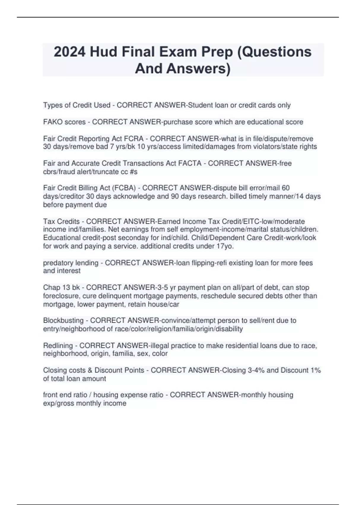 2024 Hud Final Exam Prep (Questions And Answers) Types of Credit Used - CORRECT ANSWER-Student loan or credit cards only FAKO scores - CORRECT ANSWER-purchase score which are educational score Fair Credit Reporting Act FCRA - CORRECT ANSWER-what is in file/dispute/remove 30 days/remove bad 7 yrs/bk 10 yrs/access limited/damages from violators/state rights Fair and Accurate Credit Transactions Act FACTA - CORRECT ANSWER-free cbrs/fraud alert/truncate cc #s Fair Credit Billing Act (FCBA) - CORRECT ANSWER-dispute bill error/mail 60 days/creditor 30 days acknowledge and 90 days research. billed timely manner/14 days before payment due Tax Credits - CORRECT ANSWER-Earned Income Tax Credit/EITC-low/moderate income ind/families. Net earnings from self employment-income/marital status/children. Educational credit-post seconday for ind/child. Child/Dependent Care Credit-work/look for work and paying a service. additional credits under 17yo. predatory lending - CORRECT ANSWER-loan flipping-refi existing loan for more fees and interest Chap 13 bk - CORRECT ANSWER-3-5 yr payment plan on all/part of debt, can stop foreclosure, cure delinquent mortgage payments, reschedule secured debts other than mortgage, lower payment, retain house/car Blockbusting - CORRECT ANSWER-convince/attempt person to sell/rent due to entry/neighborhood of race/color/religion/familia/origin/disability Redlining - CORRECT ANSWER-illegal practice to make residential loans due to race, neighborhood, origin, familia, sex, color Closing costs & Discount Points - CORRECT ANSWER-Closing 3-4% and Discount 1% of total loan amount front end ratio / housing expense ratio - CORRECT ANSWER-monthly housing exp/gross monthly income Gross Monthly Income (GMI) - CORRECT ANSWER-hourly-10/hrx35hrsx52 wks/12......wkly 750x52wksx12=.....biwkly-1000.x26/12=....semimnth1200.x2=...selfemploy-average gross 70587./24= back-end ratio - CORRECT ANSWER-debt exp/gross debt to income ratio Affordability - CORRECT ANSWER-FE/Conv 28, FHA 31, FHAEE 33, Rent 30....BE/Conv 36(45-50), FHA 43, FHAEE 45, Rent 36 Max Mnthly House Pymt - CORRECT ANSWER-FERxgmi BERxgmi-debts 2nd mort/piggy back loan - CORRECT ANSWER-lower 1st mort, avoid private morg ins, repairs, education mortg terms - CORRECT ANSWER-interest only-pay only interest for a fixed term after borrower pays principal/interest, fixed rate-interest fixed 30 yrs or 10-15, Adjustableinterest adjust and has cap Loan-to-Value Ratio - CORRECT ANSWER-LTV%=loan bal/sales price/appraised x 100