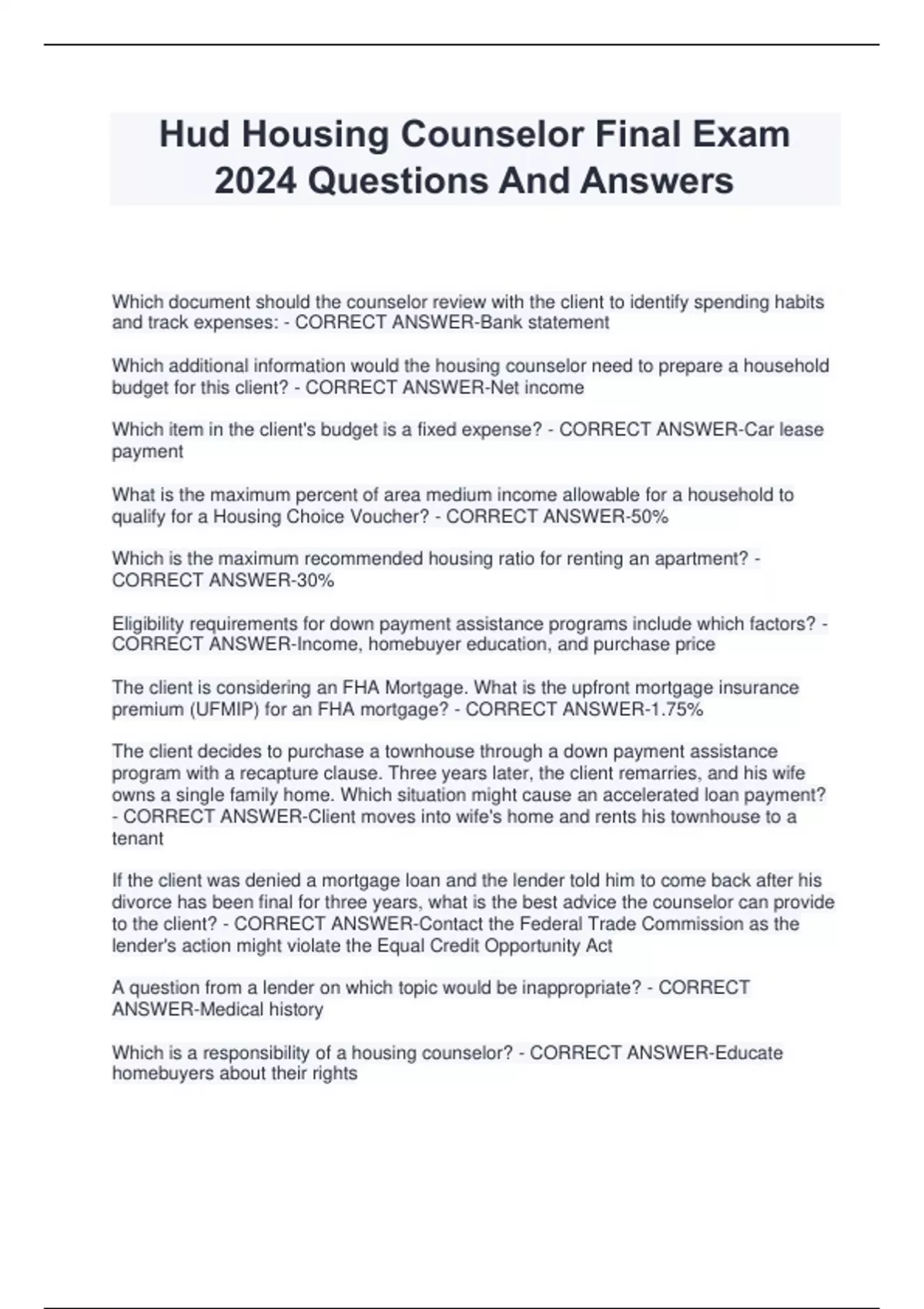 Hud Housing Counselor Final Exam 2024 Questions And Answers Which document should the counselor review with the client to identify spending habits and track expenses: - CORRECT ANSWER-Bank statement Which additional information would the housing counselor need to prepare a household budget for this client? - CORRECT ANSWER-Net income Which item in the client's budget is a fixed expense? - CORRECT ANSWER-Car lease payment What is the maximum percent of area medium income allowable for a household to qualify for a Housing Choice Voucher? - CORRECT ANSWER-50% Which is the maximum recommended housing ratio for renting an apartment? - CORRECT ANSWER-30% Eligibility requirements for down payment assistance programs include which factors? - CORRECT ANSWER-Income, homebuyer education, and purchase price The client is considering an FHA Mortgage. What is the upfront mortgage insurance premium (UFMIP) for an FHA mortgage? - CORRECT ANSWER-1.75% The client decides to purchase a townhouse through a down payment assistance program with a recapture clause. Three years later, the client remarries, and his wife owns a single family home. Which situation might cause an accelerated loan payment? - CORRECT ANSWER-Client moves into wife's home and rents his townhouse to a tenant If the client was denied a mortgage loan and the lender told him to come back after his divorce has been final for three years, what is the best advice the counselor can provide to the client? - CORRECT ANSWER-Contact the Federal Trade Commission as the lender's action might violate the Equal Credit Opportunity Act A question from a lender on which topic would be inappropriate? - CORRECT ANSWER-Medical history Which is a responsibility of a housing counselor? - CORRECT ANSWER-Educate homebuyers about their rights In order to minimize the impact on the client's credit score, what is the maximum time frame within which the client should apply for pre-approval from multiple lenders? - CORRECT ANSWER-30-day period. Which is a responsibility of a home inspector? - CORRECT ANSWER-A) Evaluate condition of the home B) Examine medical systems C) identify items to be repaired or replaced